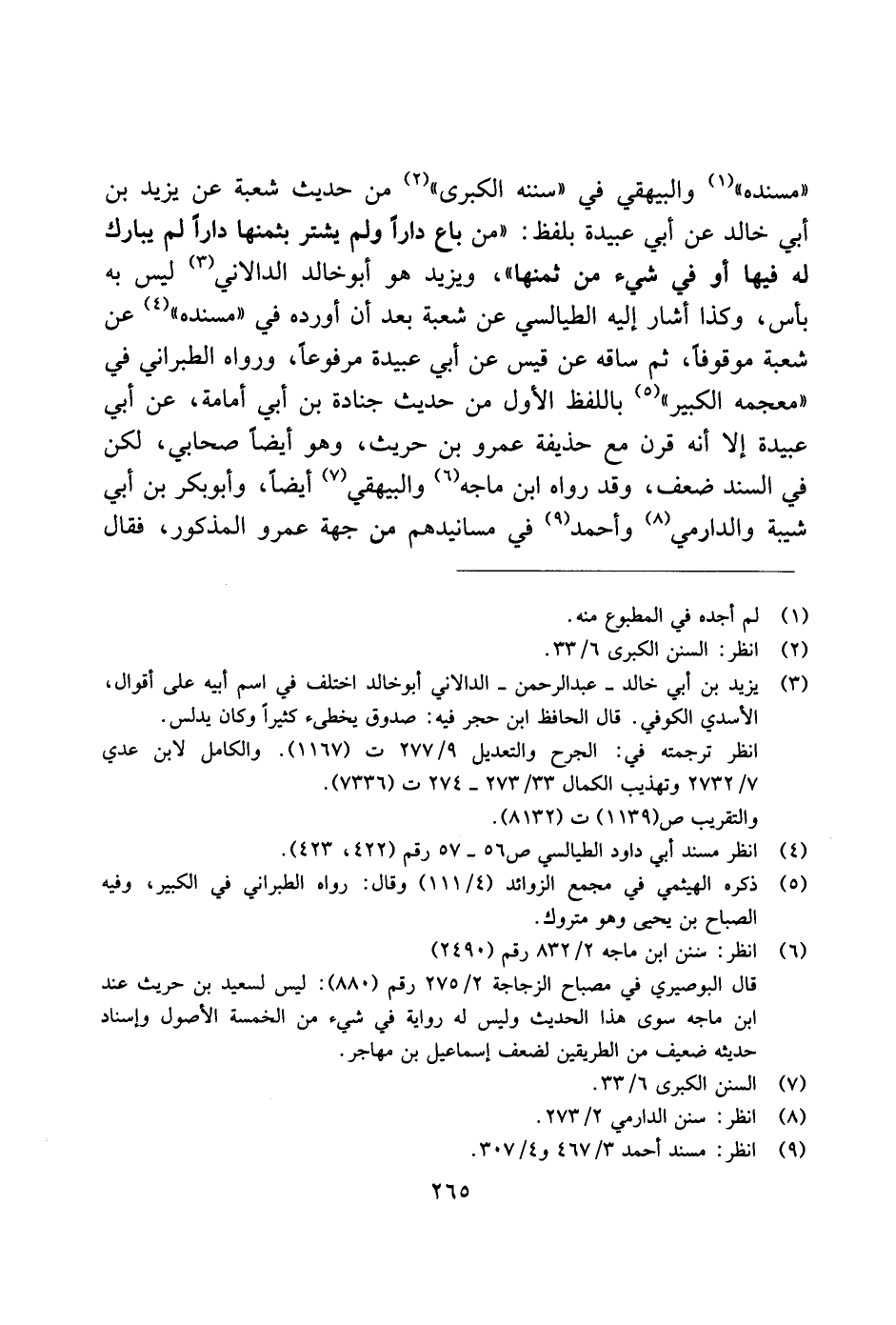 "مسنده" والبيهقي في "سننه الكبرى" من حديث شعبة عن يزيد بن أبي خالد عن أبي عبيدة بلفظ: "من باع دارًا ولم يشتر بثمنها دارًا لم يبارك له فيها أو في شيء من ثمنها"، ويزيد هو أبو خالد الدالاني ليس به بأس، وكذا أشار إليه الطيالسي عن شعبة بعد أن أورده في "مسنده" عن شعبة موقوفًا، ثم ساقه عن قيس عن أبي عبيدة مرفوعًا، ورواه الطبراني في "معجمه الكبير" باللفظ الأول من حديث جنادة بن أبي أمامة، عن أبي عبيدة إلا أنه قرن مع حذيفة عمرو بن حريث، وهو أيضًا صحابي، لكن في السند ضعف، وقد رواه ابن ماجه والبيهقي أيضًا، وأبو بكر بن أبي شيبة والدرامي وأحمد في مسانيدهم من جهة عمرو المذكور، فقال