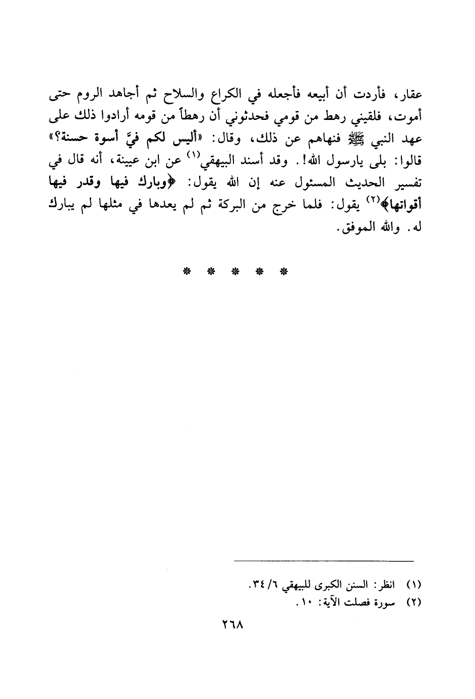 عقار، فأردت أن أبيعه فأجلعه في الكراع والسلاح ثم أجاهد الروم حتى أموت، فلقيني رهط من قومي فحدثوني أن رهطًا من قومه أرادوا ذلك على عهد النبي صلى الله عليه وسلم فنهاهم عن ذلك، وقال: "أليس لكم في أسوة حسنة؟ " قالوا: بلى يا رسول الله!. وقد أسند البيهقي عن ابن عيينة، أنه قال في تفسير الحديث المسئول عنه إن الله يقول: (وبارك فيها وقدر فيها أقواتها) يقول: فلما خرج من البركة ثم لم يعدها في مثلها لم يبارك له. والله الموفق.