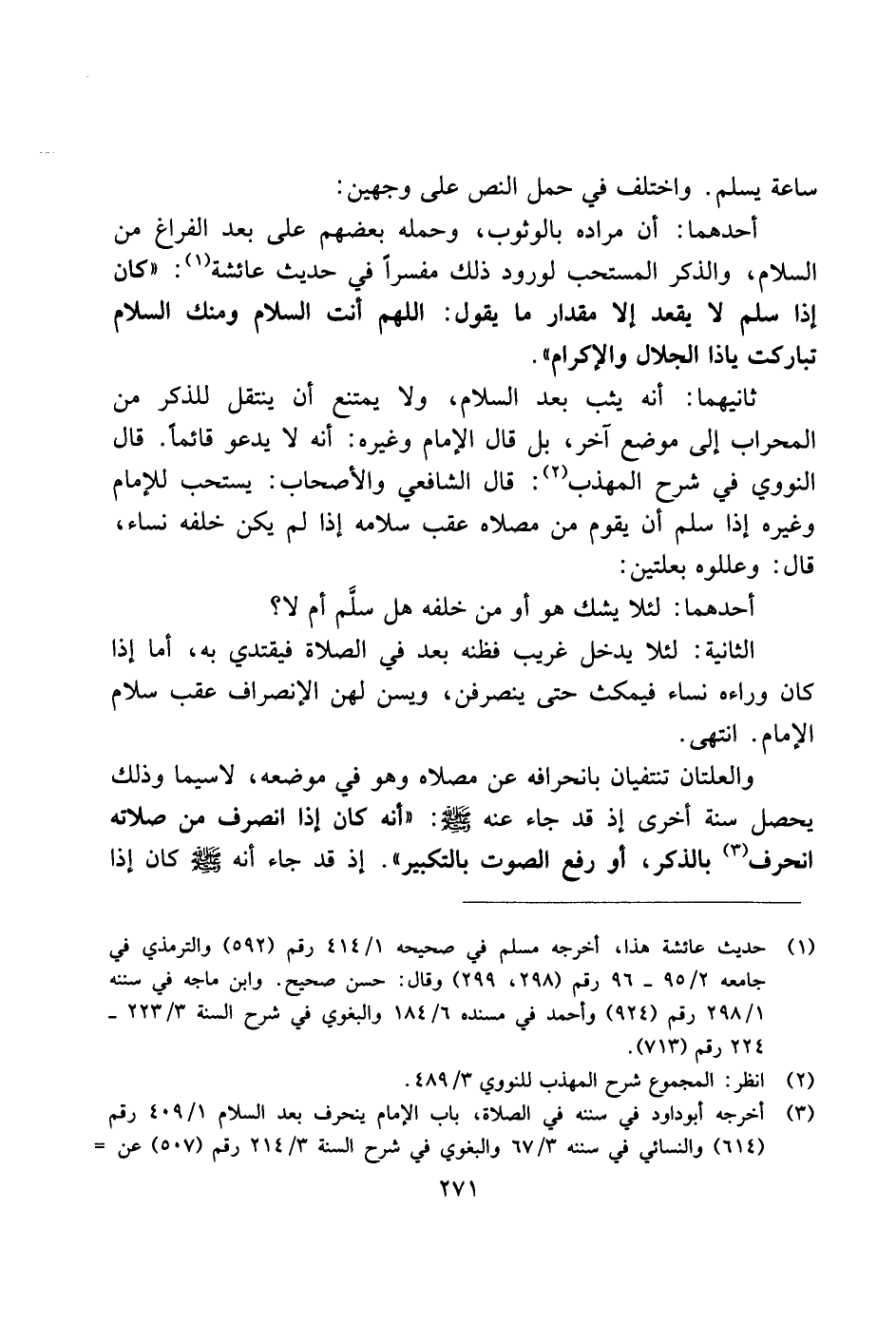 ثانيهما: أنه يثب بعد السلام، ولا يمنع أن ينتقل للذكر من المحراب إلى موضع آخر، بل قال الإمام وغيره: أنه لا يدعو قائمًا. قال النووي في شرح المهذب: قال الشافعي والأصحاب: يستحب للإمام وغيره إذا سلم أن يقوم من مصلاه عقب سلامه إذا لم يكن خلفه نساء، قال: وعللوه بعلتين:
