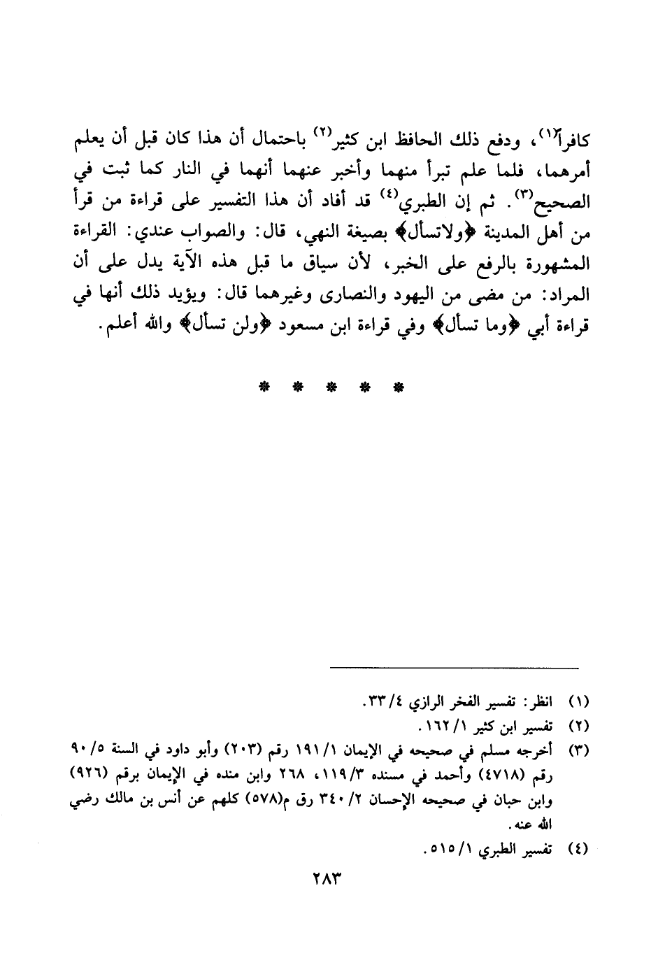 كافر، ودفع ذلك الحافظ ابن كثير باحتمال أن هذا كان قبل أن يعلم أمرهما، فلما علم تبرأ منهما وأخبر عنهما أنهما في النار كما ثبت في الصحيح. ثم إن الطبري قد أفاد أن هذا التفسير على قراءة من قرأ من أهل المدينة (ولا تسأل) بصيغة النهي، قال: والصواب عندي: القراءة المشهورة بالرفع على الخبر، لأن سياق ما قبل هذه الآية يدل على أن المراد: من مضى من اليهود والنصارى وغيرهما قال: ويؤيد ذلك أنها في قراءة أبي (وما تسأل) وفي قراءة ابن مسعود (ولن تسأل) والله أعلم.