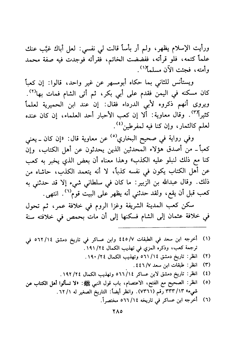 ويستأنس للثاني بما حكاه أبو مسهر عن غير واحد، قالوا: إن كعبًا كان مسكنه في اليمن فقدم على أبي بكر، ثم أتى الشام فمات بها. ويروى أنهم ذكروه لأبي الدرداء فقال: إن عند ابن الحميري لعلمًا كثيرًا. وقال معاوية: ألا إن كعب الأحبار أحد العلماء، إن كان عنده لعلم كالثمار، وإن كنا فيه لمفرطين.