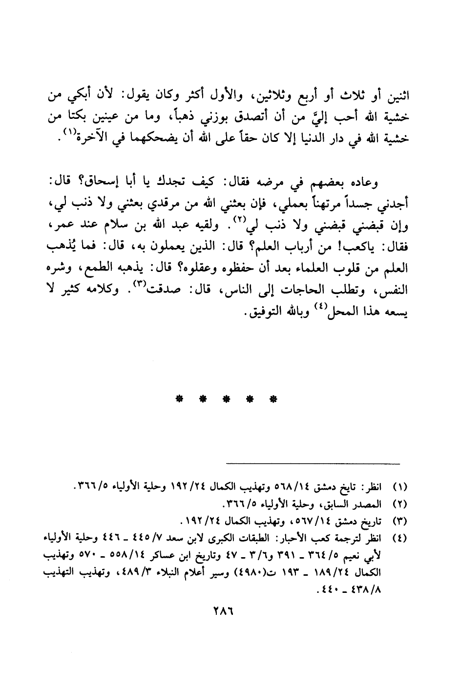 وعاده بعضهم في مرضه فقال: كيف تجدك يا أبا إسحاق؟ قال: أجدني جسدًا مرتهنًا بعملي، فإن بعثني الله من مرقدي بعثني ولا ذنب لي، وغن قبضني قبضني ولا ذنب لي. ولقيه عبد الله بن سلام عند عمر، فقال: يا كعب! من أرباب العلم؟ قال: الذين يعلمون به، قال: فما يُذهب العلم من قلوب العلماء بعد أن حفظوه وعقلوه؟ قال: يذهبه الطمع، وشره النفس، وتطلب الحاجات إلى الناس، قال: صدقت. وكلامه كثير لا يسعه هذا المحل وبالله التوفيق.