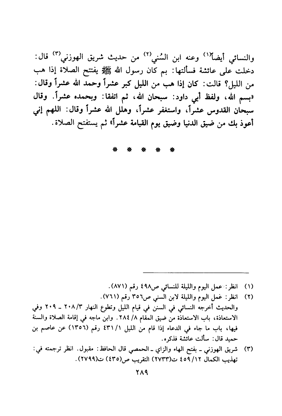 والنسائي أيضًا وعنه ابن السُني من حديث شريق الهوزني قال: دخلت على عائشة فسألتها: بم كان رسول الله صلى الله عليه وسلم يفتتح الصلاة إذا هب من الليل؟ قالت: كان إذا هب من الليل كبر عشرًا وحمد الله عشرًا وقال: "بسم الله، ولفظ أبي داود: سبحان الله، ثم اتفقا: وبحمده عشرًا. وقال سبحان القدوس عشرًا، واستغفر عشرًا، وهلل الله عشرًا وقال: اللهم إني أعوذ بك من ضيق الدنيا وضيق يوم القيامة عشرًا" ثم يستفتح الصلاة.