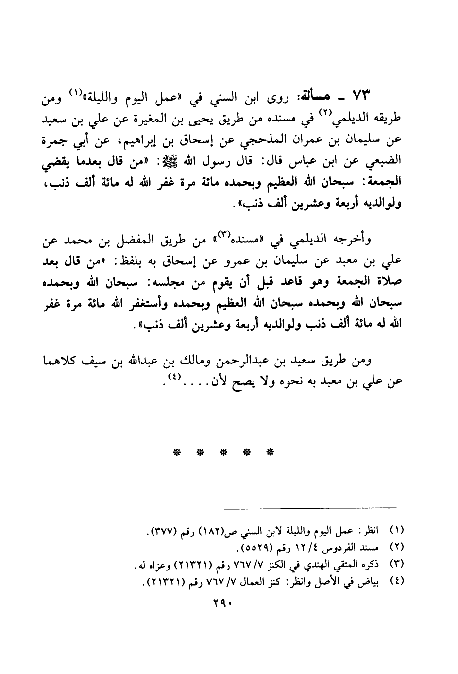 73 - مسألة: روى ابن السني في "عمل اليوم والليلة" ومن طريقة الديلمي في مسنده من طريق يحيى بن المغيرة عن علي بن سعيد عن سلميان بن عمران المذحجي عن إسحاق بن إبراهيم، عن أبي جمرة الضبعي عن ابن عباس قال: قال رسول الله صلى الله عليه وسلم: "من قال بعدما يقضي الجمعة: سبحان الله العظيم وبحمده مائة مرة غفر الله له مائة الف ذنب، ولوالديه أربعة وعشرين ألف ذنبط.