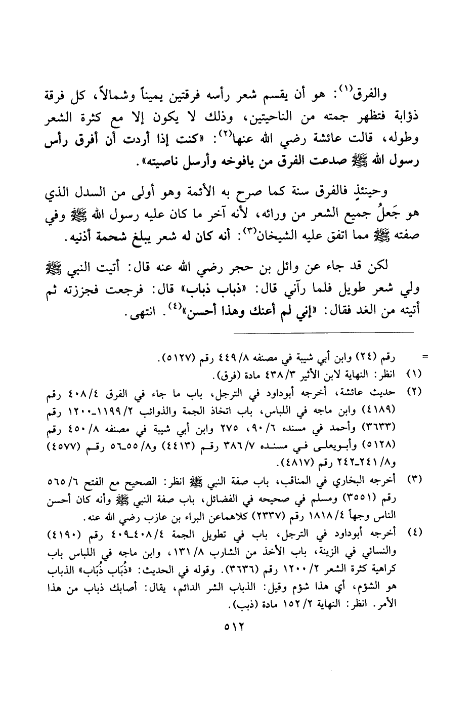 وحينئذٍ فالفرق سنة كما صرح به الأئمة وهو أولى من السدل الذي هو جَعلُ ميع الشعر من ورائه، لأنه آخر ما كان عليه رسول الله صلى الله عليه وسلم وفي صفته صلى الله عليه وسلم ما اتفق عليه الشيخان: أنه كان له شعر يبلغ شحمة أذنيه.
