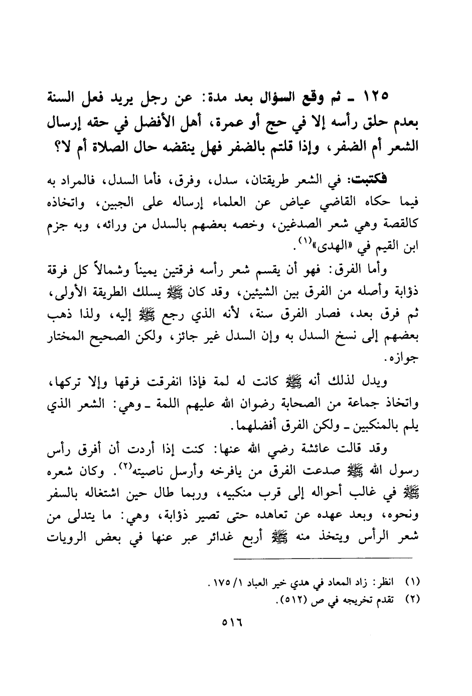 125 - ثم وقع السؤال بعد مدة: عن رجل يريد فعل السنة بعدم حلق رأسه إلا في حج أو عمرة، أهل الأفضل في حقه إرسال الشعر أم الضفر، وإذا قلتم بالضفر فهل ينقضه حال الصلاة أم لا؟
