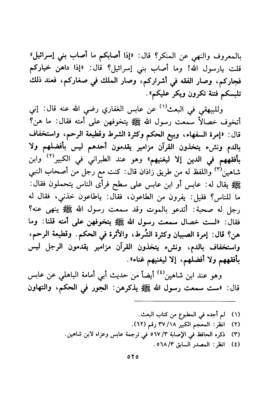 وللبيهقي في البعث عن عابس الغفاري رضي الله عنه قال: إني أتخوف خصالاً سمعت رسول الله صلى الله عليه وسلم يتخوفهن على أمته فقال: ما هن؟ قال: "إمرة السفهاء، وبيع الحكم وكثرة الشرط وقطعية الرحم، واستخفاف بالدم ونشء يتخذون القرآن مزامير يقدمون أحدهم ليس بأفضلهم ولا بأفقههم في الدين إلا ليغنيهم" وهو عند الطبراني في الكبير وابن شاهين واللفظ له من طريق زاذان قال: كنت مع رجل من أصحاب النبي صلى الله عليه وسلم يقال له: عابس أو ابن عابس على سطح فرأى الناس يتحملون فقال: ما للناس؟ فقيل: يفرون من الطاعون، فقال: يا طاعون خذني، فقال له رجل له صحبة: أتدعو بالموت وقد سمعت رسول الله صلى الله عليه وسلم ينهي عنه؟ فقال: "لست خصال سمعت رسول الله صلى الله عليه وسلم يتخوفهن على أمته قلنا: وما هن؟ قال: إمرة الصبيان وكثرة الشُرط، والأثرة في الحكم. وقطيعة الرحم، واستخفاف بالدم، ونشء يتخذون القرآن مزامير يقدمون الرجل ليس بأفقههم ولا أضلهم، إلا ليغنيهم غناء".