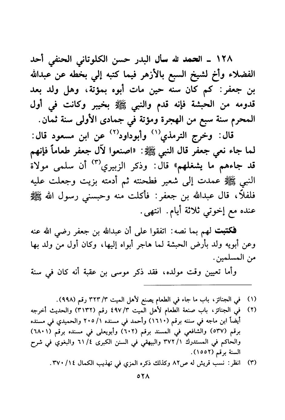 128 - الحمد لله سأل البدر حسن الكلوتاني الحنفي أحد الفضلاء وأخ لشيخ السبع بالأزهر فيما كتبه إلى بخطه عن عبد الله بن جعفر: كم كان سنة حين مات ابوه بمؤتة، وهل ولد بعد قدومه م الحبشة فإنه قدم والنبي صلى الله عليه وسلم بخيبر وكانت في أول المحرم سنة سبع من الهجرة ومؤتة في جمادي الأولى سنة ثمان.