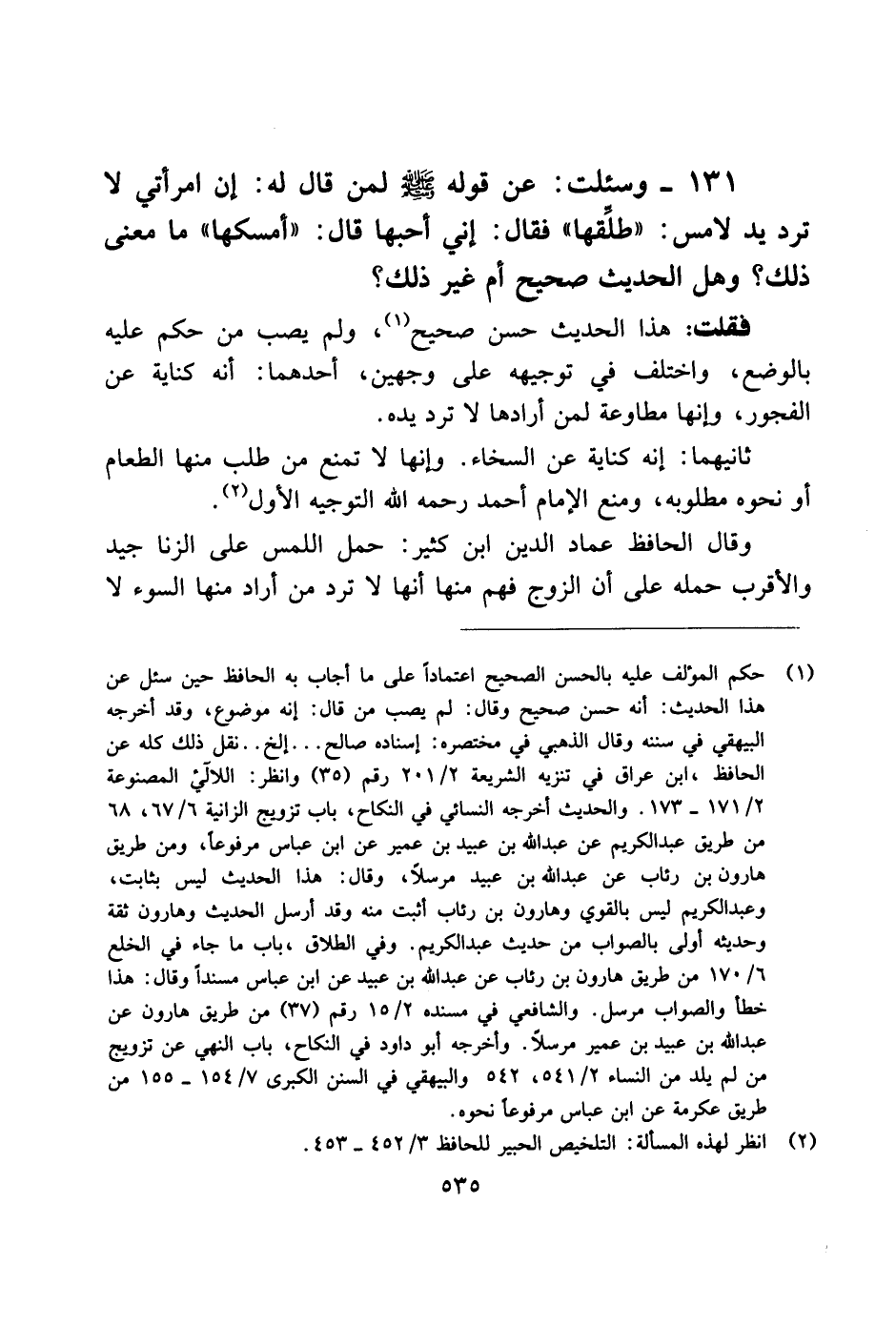 131 - وسئلت: عن قوله صلى الله عليه وسلم لمن قال له: إن امرأتي لا ترد يد لامس: "طلقها" فقال: إني أحبها قال: "أمسكها" ما معنى ذلك؟ وهل الحديث صحيح أم غير ذلك؟