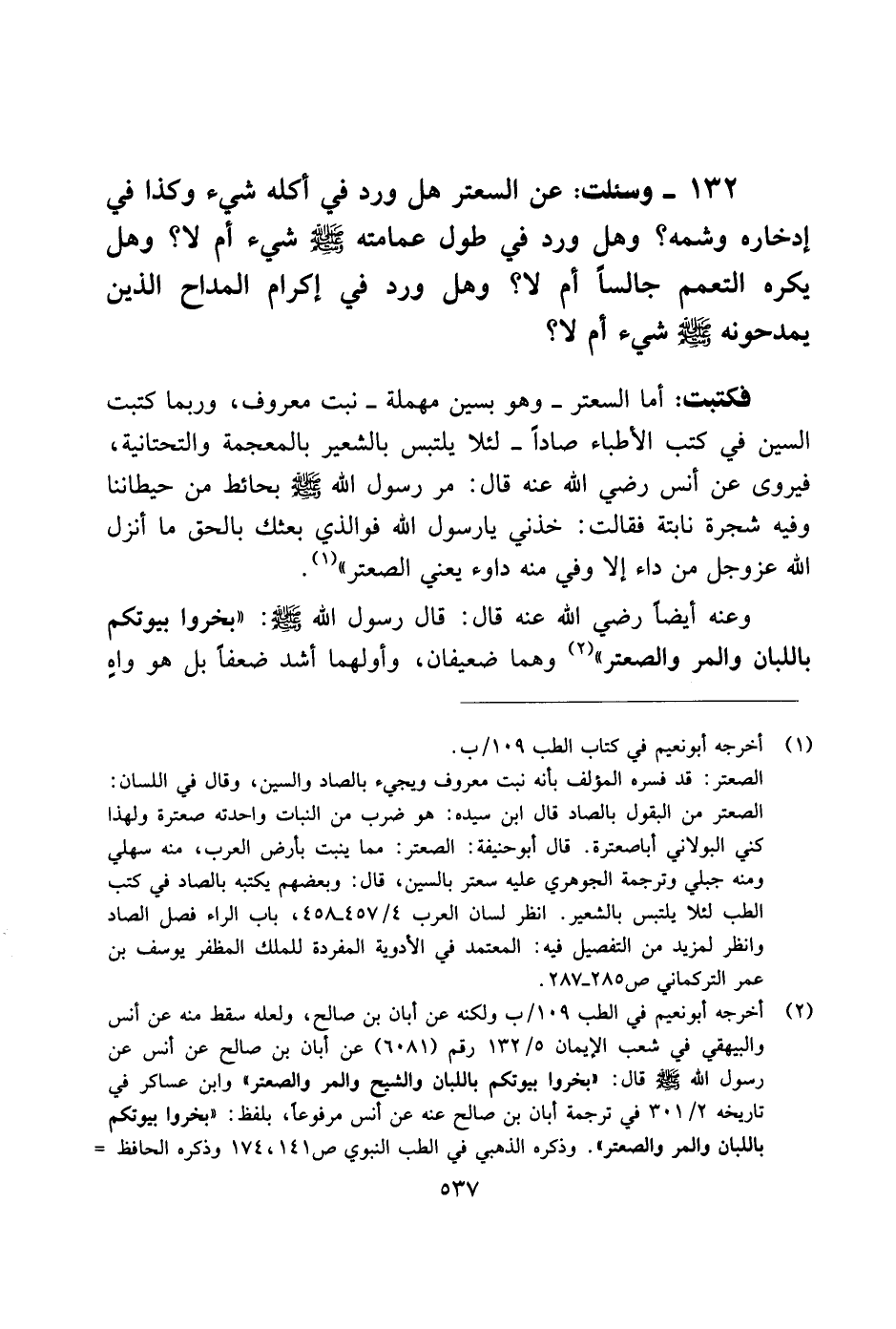 فكتبت: أما السعتر ـ وهو بسين مهملة ـ نبت معروف، وربما كتبت السين في كتب الأطباء صادًا ـ لئلا يلتبس بالشعير بالمعجمة والتحتانية، فيروى عن أنس رضي الله عنه قال: مر رسول الله صلى الله عليه وسلم بحائط من حيطاننا وفيه شجرة نابتة فقالت: خذني يا رسول الله فوالذي بعثك بالحق ما أنزل الله عز وجل من داء إلا وفي منه دواء يعني الصعتر".