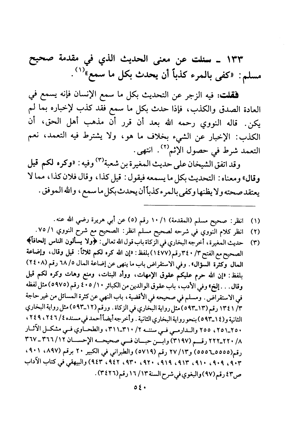 133 - سئلت عن معنى الحديث الذي في مقدمة صحيح مسلم: "كفى بالمرء كذبًا أن يحدث بكل ما سمع".