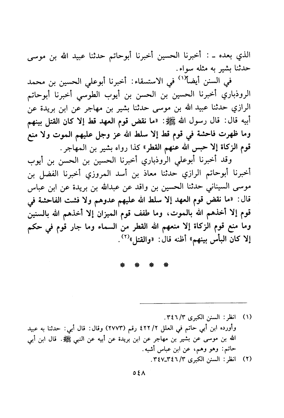 في السنن أيضًا في الاستسقاء: أخبرنا أبو علي الحسين بن محمد الروذباري أخبرنا الحسين بن الحسن بن أيوب الطوسي أخبرنا أبو حاتم الرازي حدثنا عبدي الله بن موسى حدثنا بشير بن مهاجر عن ابن بريدة عن أبيه قال: قال رسول الله صلى الله عليه وسلم: "ما نقض قوم العهد قط إلا كان القتل بينهم وما ظهرت فاحشة في قوم قط إلا سلط الله عز وجل عليهم الموت ولا منع قوم الزكاة إلا حبس الله عنهم القط"كذا رواه بشير بن المهاجر.