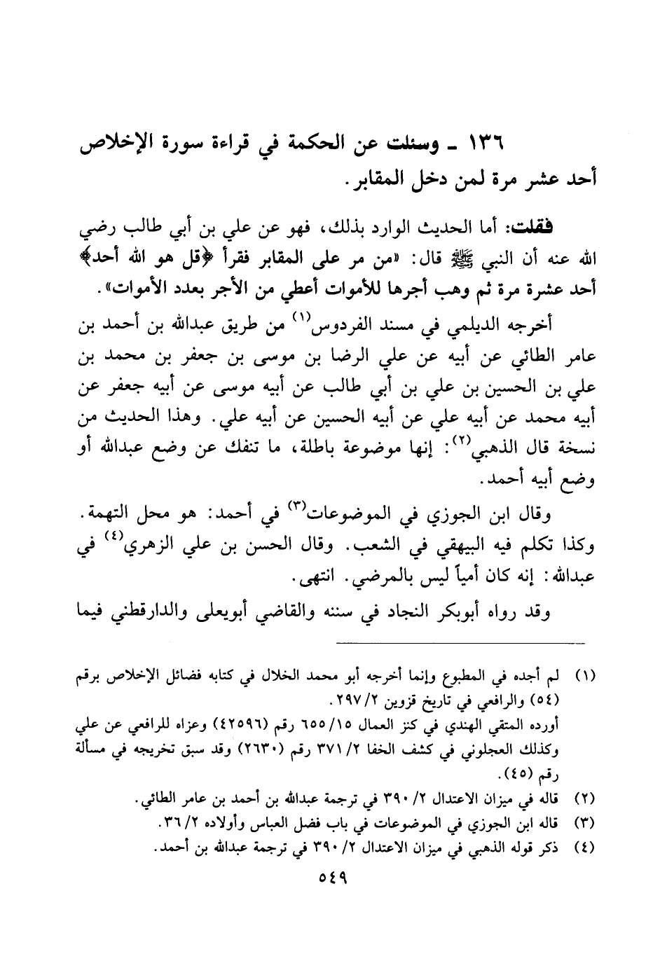 136 - وسئلت عن الحكمة في قراءة سورة الإخلاص أحد عشر مرة لمن دخل المقابر.