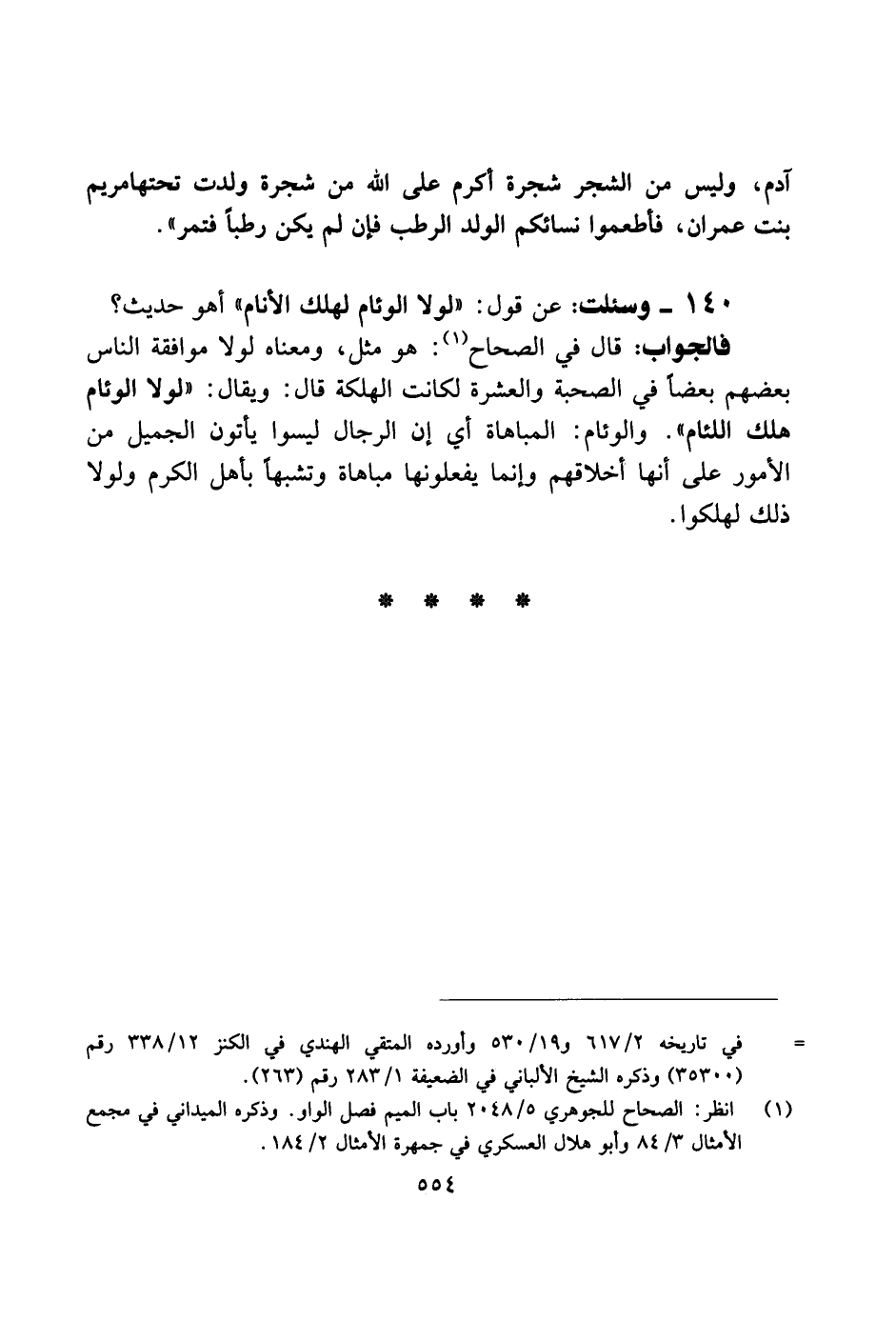 140 - وسئلت: عن قول: "لولا الوئام لهلك الأنام" أهو حديث؟