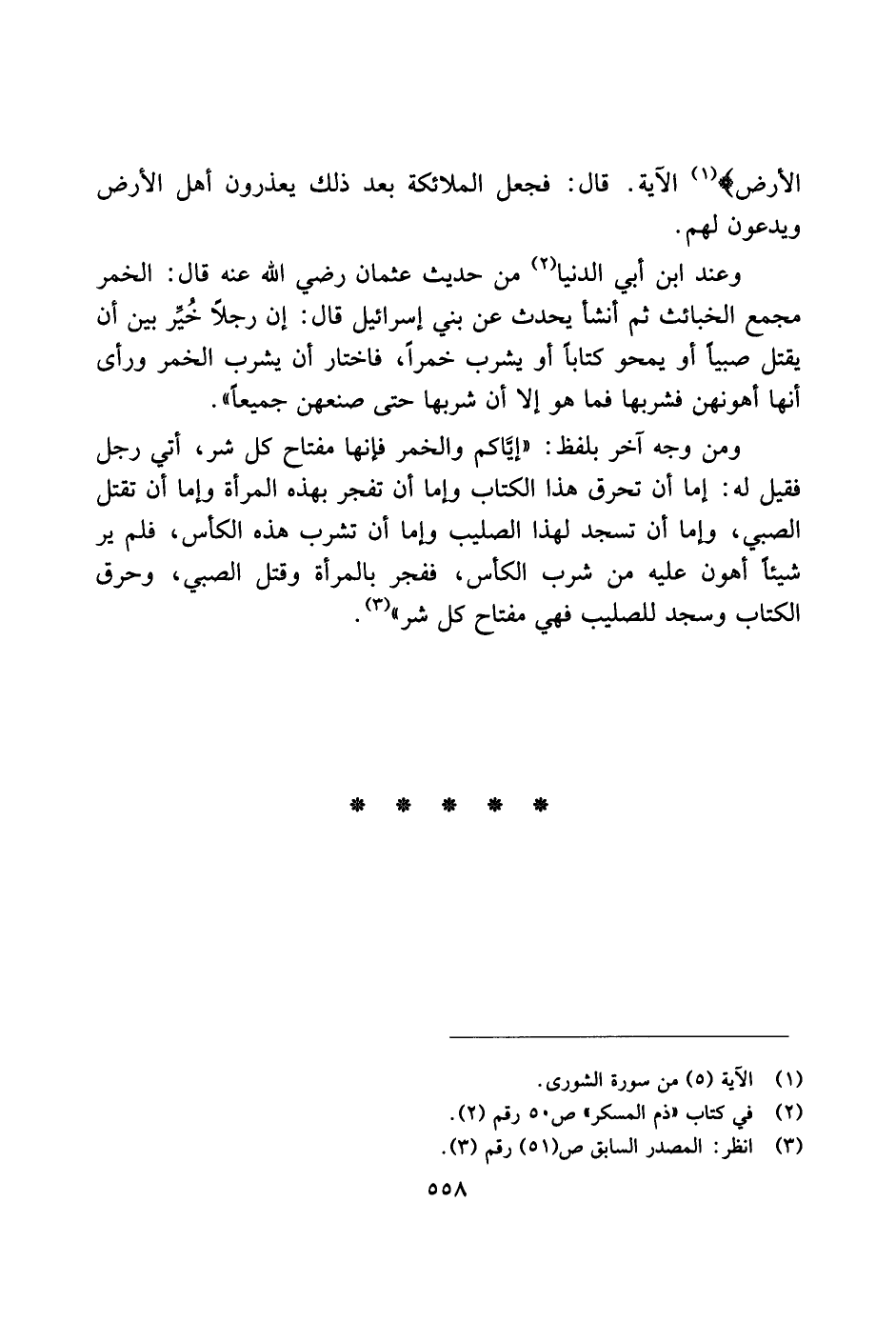 وعند ابن أبي الدنيا من حديث عثمان رضي الله عنه قال: الخمر مجمع الخبائث ثم أنشأ يحدث عن بني إسرائيل قال: إن رجلاً خير بين أن يقتل صبيًا أو يمحو كتابًا أو يشرب خمرًا، فاختار أن يشرب الخمر ورأى أنها أهونهن فشربها فما هو إلا أن شربها حتى صنعهن جميعًا".