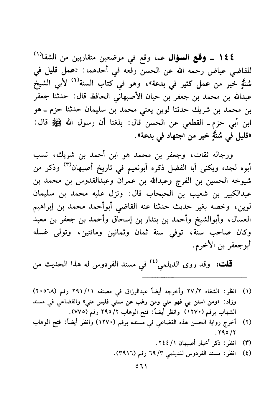 144 - وقع السؤال عما وقع في موضعين متقاربين من الشفا للقاضي عياض رحمه الله عن الحسن رفعه في أحدهما: "عمل قليل في سنة خير من عمل كثير في بدعة"، وهو في كتاب السنة لأبي الشيخ عبدالله بن محمد بن جعر بن حيان الأصبهاني الحافظ قال: حدثنا جعفر بن محمد بن شريك حدثنا لوين يعني محمد بن سليمان حدثنا حزم ـ هو ابن أبي حزم ـ القطعي عن احسن قال: بلغنا أن رسول اله صلى الله عليه وسلم قال: "قليل في سنة خير من اجتهاد في بدعة".