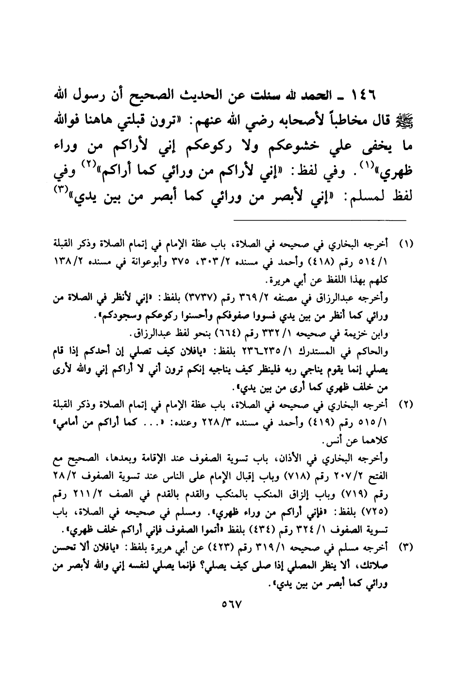 146 - الحمد لله سئلت عن الحديث الصحيح أن رسول الله صلى الله عليه وسلم قال مخاطبًا لأصحابه رضي الله عنهم: "ترون قبلتي هاهنا فوالله ما يخفى علي خشوعكم ولا ركوعكم إني لأراكم من وراء ظهري". وفي لفظ: "إني لأراكم من ورائي كما أراكم" وفي لفظ لمسلم: "إني لأبصر من ورائي كما أبصر من بين يدي"