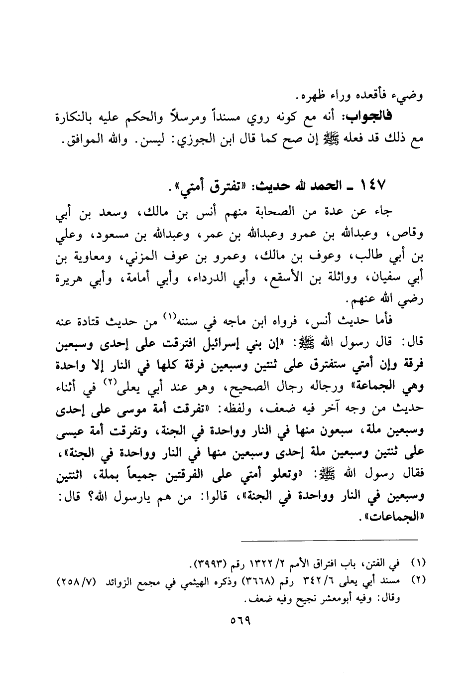 فأما حديث أنس، فرواه ابن ماجه في سننه من حديث قتادة عنه قال: قال رسول الله صلى الله عليه وسلم: "إن بني إسرائيل افترقت على إحدى وسبعين فرقة وإن أمتي ستفترق على ثنتين وسبعين فرقة كلها في النار إلا واحدة وهي الجماعة" ورجاله رجال الصحيح، وهو عند ابي يعلي في أثناء حديث من وجه آخر فيه ضعف، ولفظه: "تفرقت أمة موسى على إحدى وسبعين ملة، سبعون منها في النار وواحدة في الجنة، وتفرقت أمة عيسى على ثنتين وسبعين ملة إحدى وسبعين منها في النار وواحدة في الجنة"، فقال رسول الله صلى الله عليه وسلم: "وتعلو أمتي على الفرقتين جميعًا بملة، اثنتين وسبعين في النار وواحدة في الجنة"، قالوا: من هم يا رسول الله؟ قال: "الجماعات".