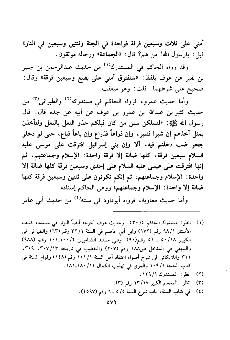 وأما حديث عمرو، فرواه الحاكم في مستدرك والطبراني من حديث كثير بن عبد الله بن عمرو بن عوف عن أبيه عن جده قال: قال رسول الله صلى الله عليه وسلم: "لتسلكن سنن من كان قبلكم حذو النعل بالنعل ولتأخذن بمثل أخذهم إن شبرا فشبر، وإن ذراعًا فذراع وإن باعًا فباع، حتى لو دخلو جحر ضب دخلتم فيه، ألا وإن بني إسرائيل افترقت على موسى عليه السلام سبعين فرقة، كلها ضالة إلا فرقة واحدة: الإسلام وجماعتهم، ثم إنها افترقت على عيسى عليه السلام على إحدى وسبعين فرقة كلها ضالة إلا واحدة: الإسلام وجماعتهم، ثم إنكم تكونون على ثنتين وسبعين فرقة كلها ضالة إلا واحدة: الإسلام وجماعتهم" وهي الحاكم إسناده.