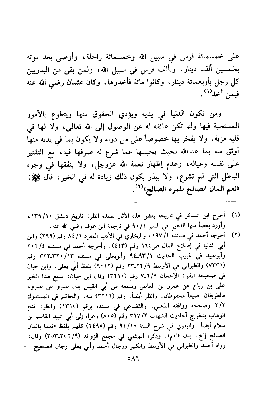 على خمسمائة فرس في سبيل الله وخمسائة راحلة، وأوصى بعد موته بخمسين ألف دينار، وبألف فرس في سبيل الله، ولمن بقى من البدريين كل رجل بأربعمائة دينار، وكانوا مائة فأخذوها، وكان عثمان رضي الله عنه فيمن أخذ.