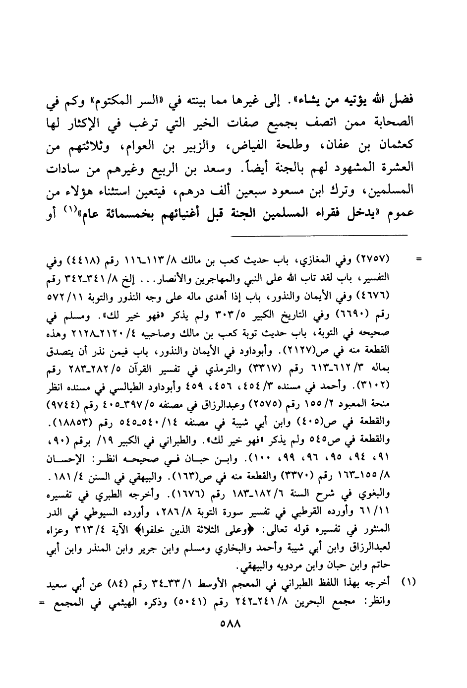 فضل الله يؤتيه من يشاء". إلى غيرها مما بينته في "السر المكتوم" وكم في الصحابة ممن اتصف بجميع صفات الخير التي ترغب في الإكثار لها كعثمان بن عفان، وطلحة الفياض، والزبير بن العوام، وثلاثتهم من العشرة المشهود لهم بالجنة أيضًا. وسعد بن الربيع وغيرهم من سادات المسلمين، وترك ابن مسعود سبعين ألف درهم، فيتعين استثناء هؤلاء من عموم "يدخل فقراء المسلمين الجنة قبل أغنيائهم بخمسمائة عام" أو