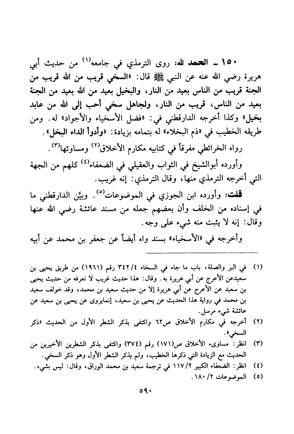 150 - الحمد لله: روى الترمذي في جامعه من حديث أبي هريرة رضي الله عنه عن النبي صلى الله عليه وسلم قال: "السخي قريب من الله قريب من الجنة قريب من الناس بعيد عن النار، والبخيل بعيد من الله بعيد من الجنة بعيد من الناس، قريب من النار، ولجاهل سخي أحب إلى الله من عابد بخيل" وكذا أخرجه الدارقطني في: "فضل الأسخياء والأجواد" له. ومن طريقه الخطيب في "ذم البخلاء" له بتمامه بزيادة: "وأدوأ الداء البخل".
