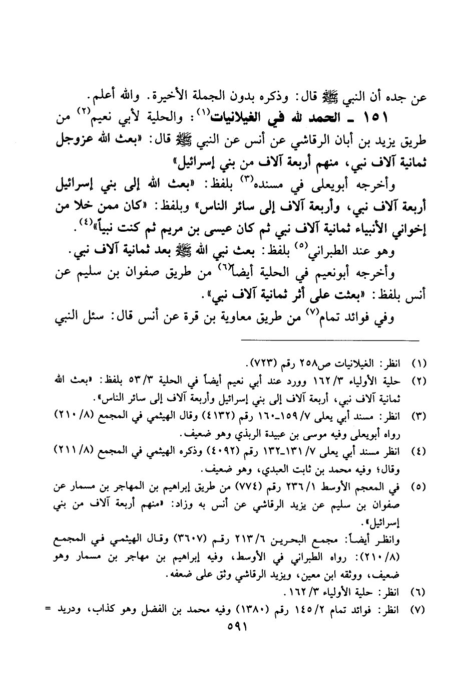 151 - الحمد لله في الغيلانيات: والحلية لأبي نعيم من طريق يزيد بن أبان الرقاشي عن أنس عن النبي صلى الله عليه وسلم قال: "بعث الله عز وجل ثمانية آلاف نبي، منهم أربعة آلاف من بني إسرائيل".