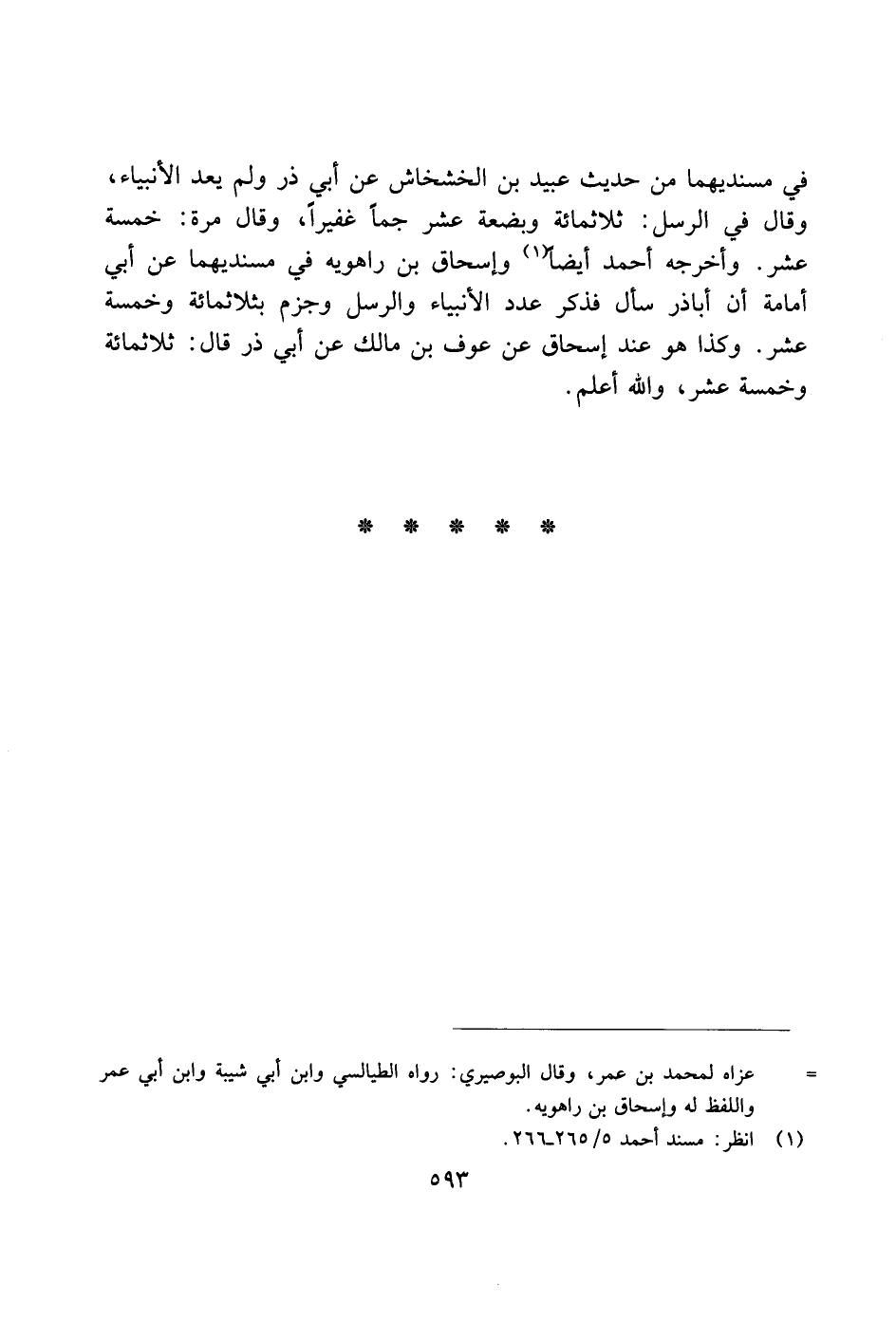 في مسنديهما من حديث عبيد بن الخشخاش عن أبي ذر ولم يعد الأنبياء، وقال في الرسل: ثلاثمائة وبضعة عشر جمًا غفيرًا، وقال مرة: خمسة عشر. وأخرجه أحمد أيضًا وإسحاق بن راهويه في مسنديهما عن أبي أمامة أن أباذر سال فذكر عدد الأنبياء والرسل وجزم بثلاثمائة وخمسة عشر. وكذا هو عند إسحاق عن عوف بن مالك عن أبي ذر قال: ثلاثمائة وخمسة عشر. والله أعلم.