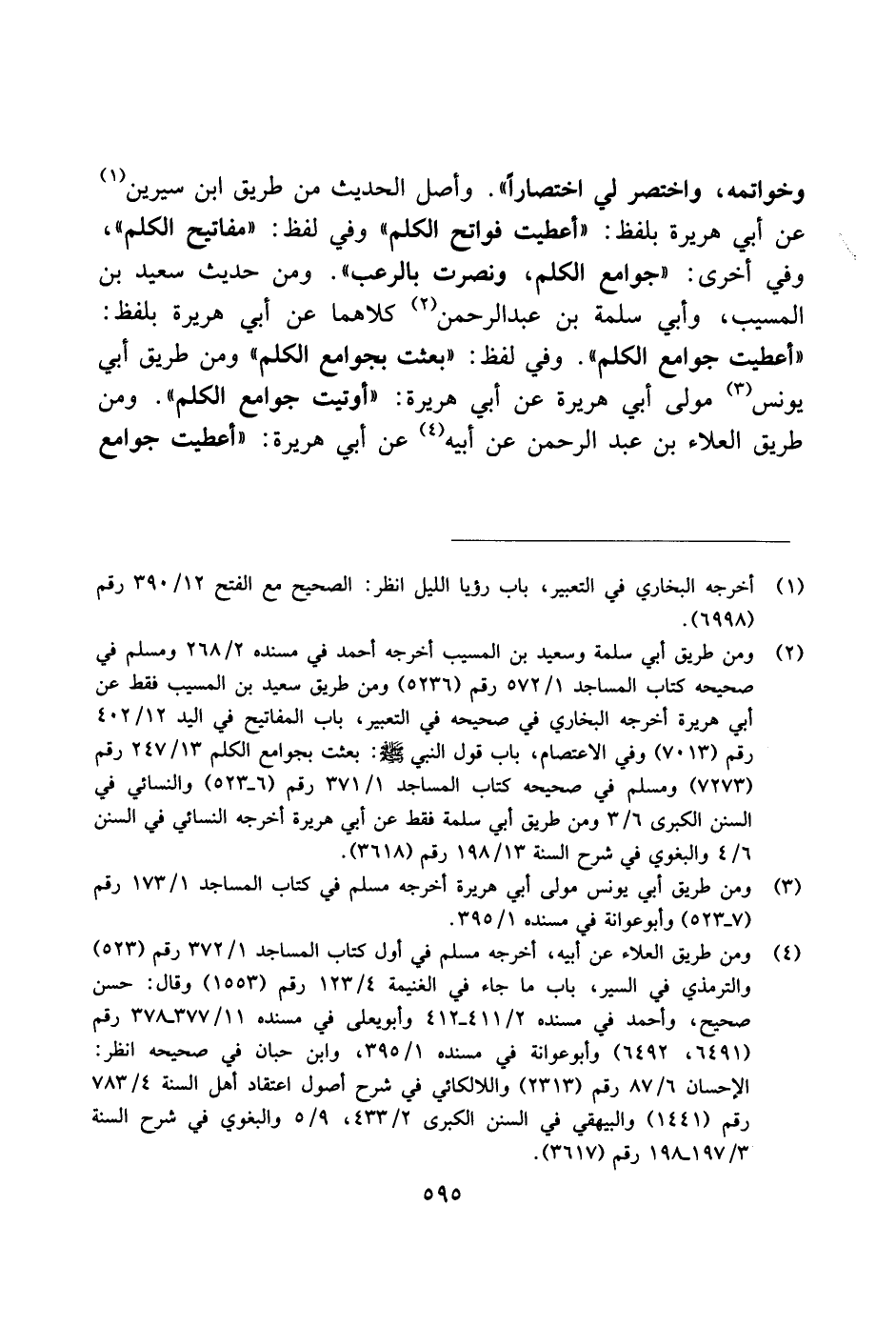وخواتمه، واختصر لي اختصارًا". واصل الحديث من طريق ابن سيرين عن أبي هريرة بلفظ: "أعطيت فواتح الكلم" وفي لفظ: "مفاتيح الكلم"، وفي أخرى: "جوامع الكلم، ونصرت بالرعب". ومن حديث سعيد بن المسيب، وأبي سلمة بن عبد الرحمن كلاهما عن أبي هريرة بلفظ: "أعطيت جوامع الكلم". وفي لفظ: "بعثت بجوامع الكلم" ومن طريق أبي يونس مولى أبي هريرة عن أبي هريرة: "أوتيت جوامع الكلم". ومن طريق العلاء بن عبد الرحمن عن أبيه عن أبي هريرة: "أعطيت جوامع