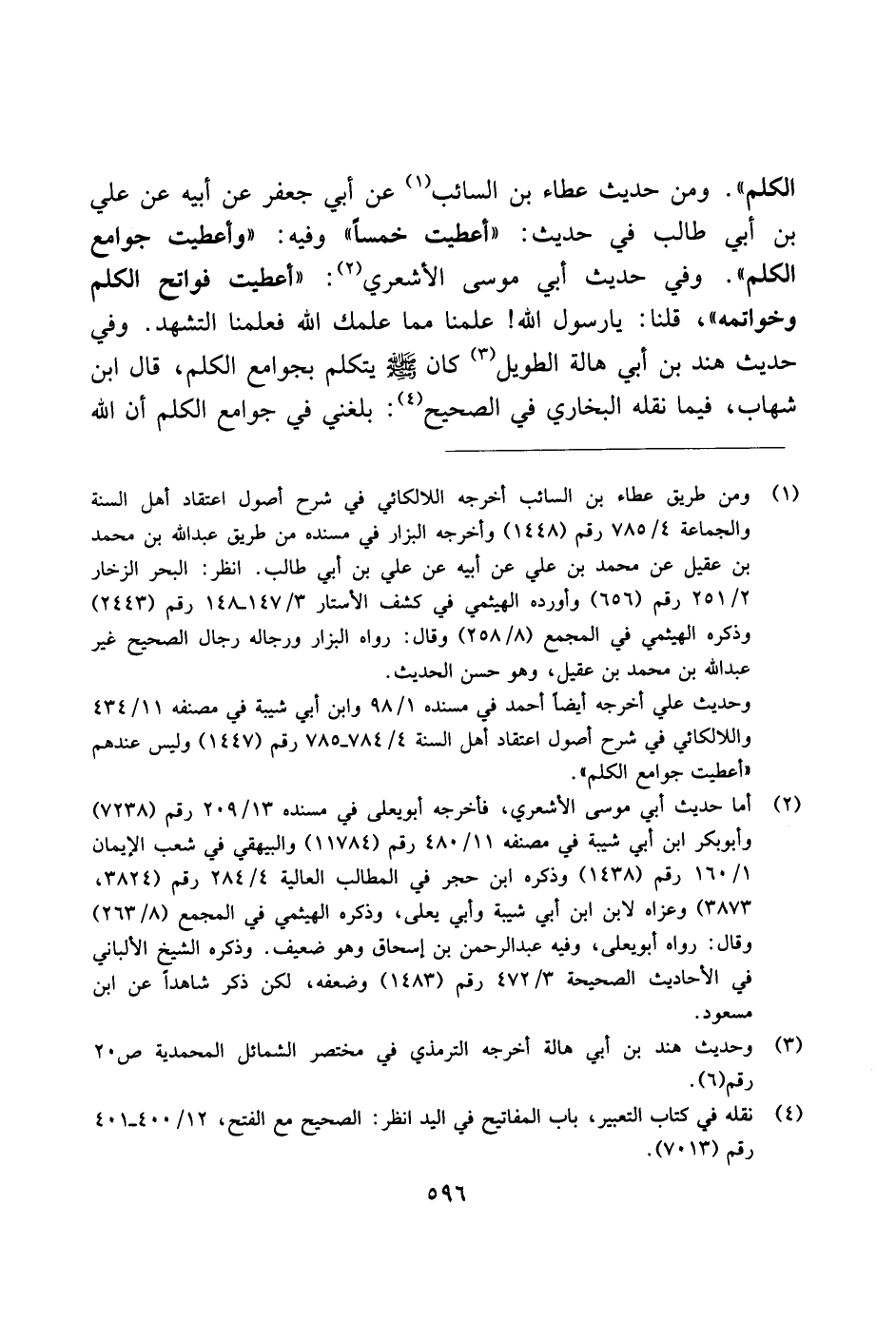 الكلم". ومن حديث عطاء بن السائب عن أبي جعفر عن أبيه عن علي بن أبي طالب في حديث: "أعطيت خمسًا" وفيه: "وأعطيت جوامع الكلم". وفي حديث أبي موسى الأشعري: "أعطيت فواتح الكلم وخواتمه"، قلنا: يا رسول الله! علمنا مما علمك الله فعلمنا التشهد. وفي حديث هند بن أبي هالة الطويل كان صلى الله عليه وسلم يتكلم بجوامع الكلم، قال ابن شهاب، فيما نقله البخاري في الصحيح: بلغني في جوامع الكلم أن الله