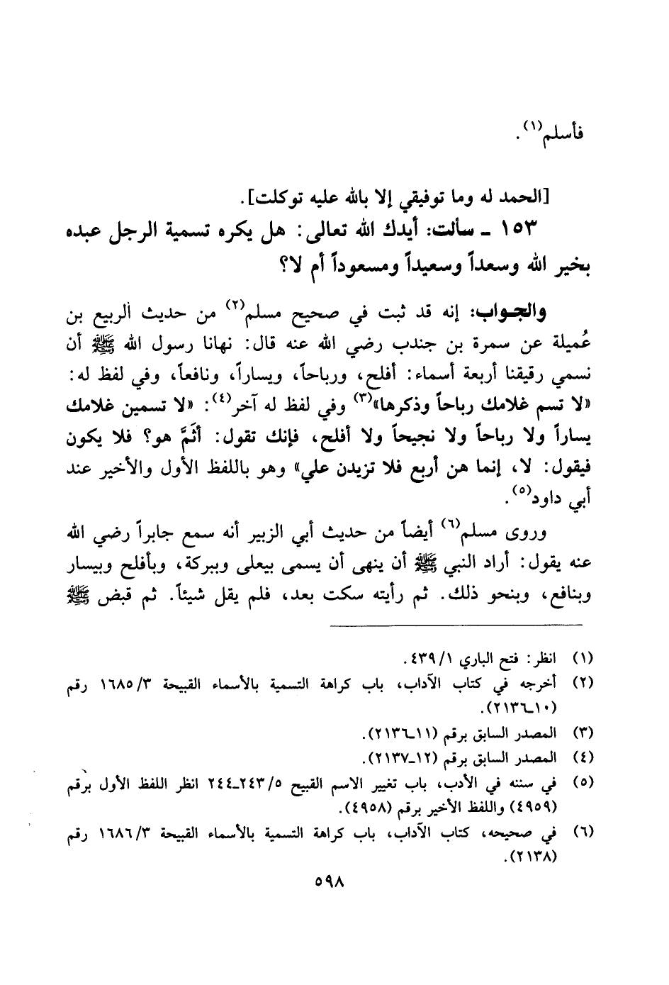 153 - سألت: أيدك الله تعالى: هل يكره تسمية الرجل عبده بخير الله وسعدًا وسعيدًا ومسعودًا أم لا؟