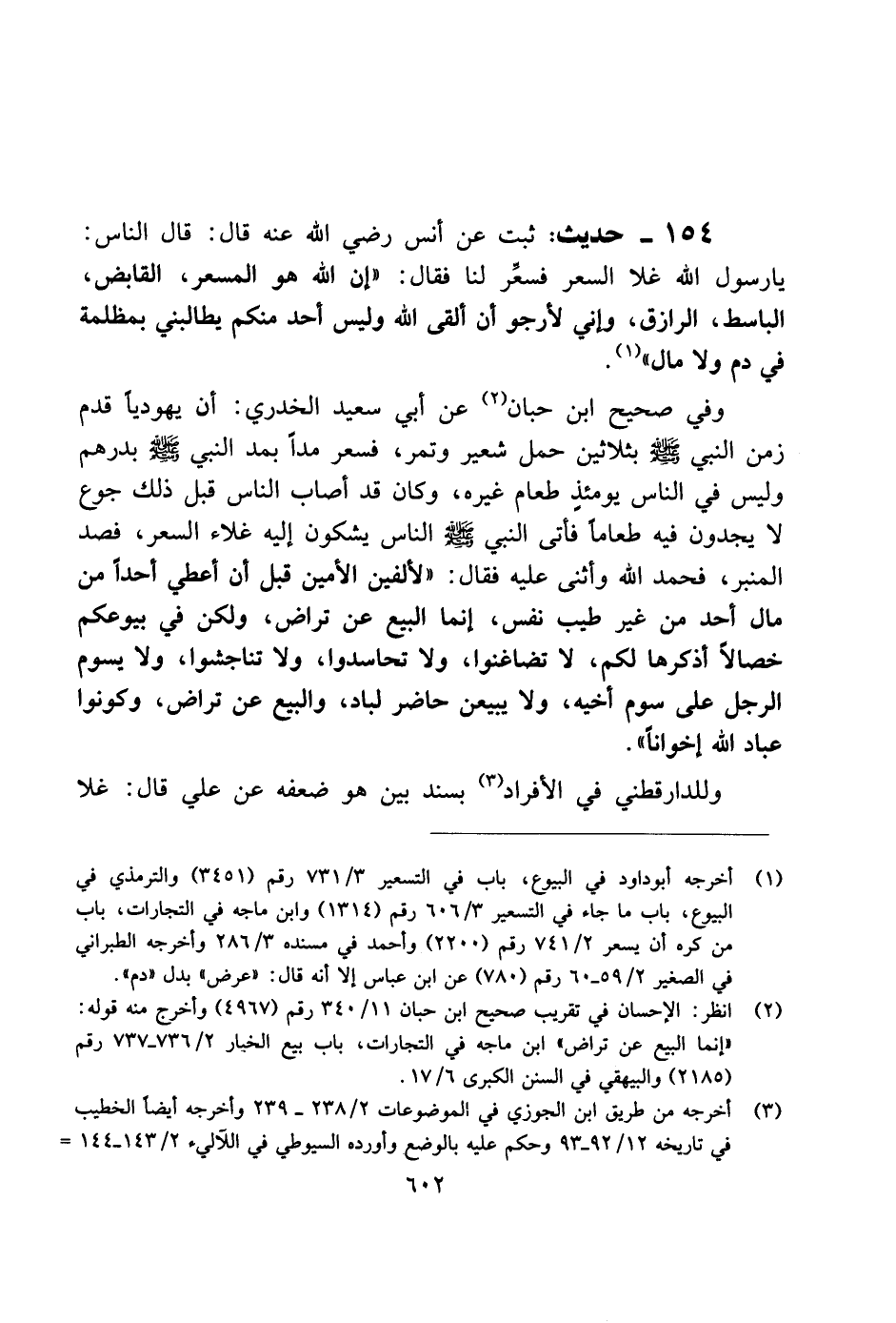 154 - حديث: ثبت عن أنس رضي الله عنه قال: قال الناس: يا رسول الله غلا السعر فسعر لنا فقال: "إن الله هو المسعر، القابض، الباسط، الرازق، وإني لأرجو أن ألقى الله وليس أحد منكم يطالبني بمظلمة في دم ولا مال".