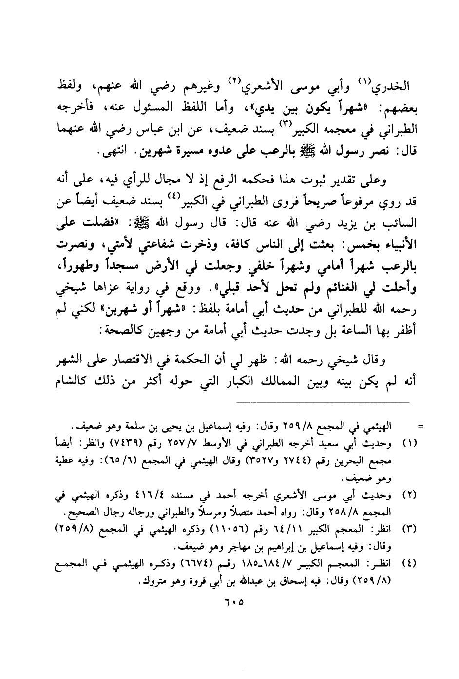 الخدري وأبي موسى الاشعري وغيرهم رضي الله عنهم، ولفظ بعضهم: "شهرًا يكون بين يدي"، وأما اللفظ المسئول عنه، فأخرجه الطبراني في معجمه الكبير بسند ضعيف، عن ابن عباس رضي اله عنهما قال: نصر رسول الله صلى الله عليه وسلم بالرعب على عدوه مسيرة شهرين. انتهى.