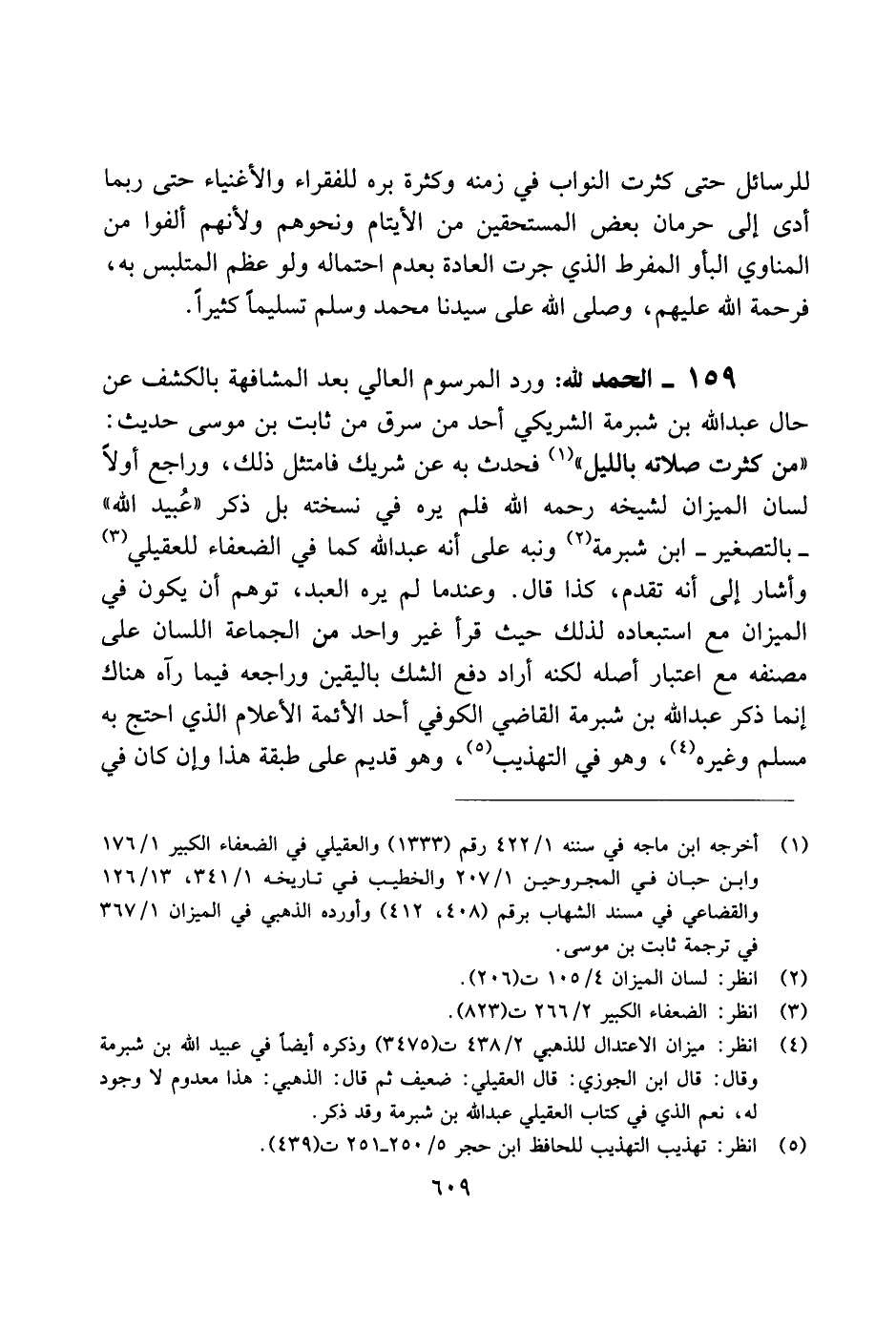 159 - الحمد لله: ورد المرسوم العالي بعد المشافهة بالكشف عن حال عبدالله بن شبرمة الشريكي أحد من سرق من ثابت بن موسى حديث: "من كثرت صلاته بالليل" فحدث به عن شريك فامتثل ذلك، وراجع أولاً لسان الميزان لشيخه رحمه الله فلم يره في نسخته بل ذكر "عُبيد الله" ـ بالتصغير ـ ابن شبرمة ونبه على أنه عبد الله كما في الضعفاء للعقيلي واشار إلى أنه تقدم، كذا قال. وعندما لم يره العبد، توهم أن يكون في الميزان مع استبعاده لذلك حيث قرأ غير واحد من الجماعة اللسان على مصنفه مع اعتبار أصله لكنه أراد دفع الشك باليقين وراجعه فيما رآه هناك إنما ذكر عبد الله بن شبرمة القاضي الكوفي أحد الأئمة الأعلام الذي احتج به مسلم وغيره، وهو في التهذيب، وهو قديم على طبقة هذا وإن كان في