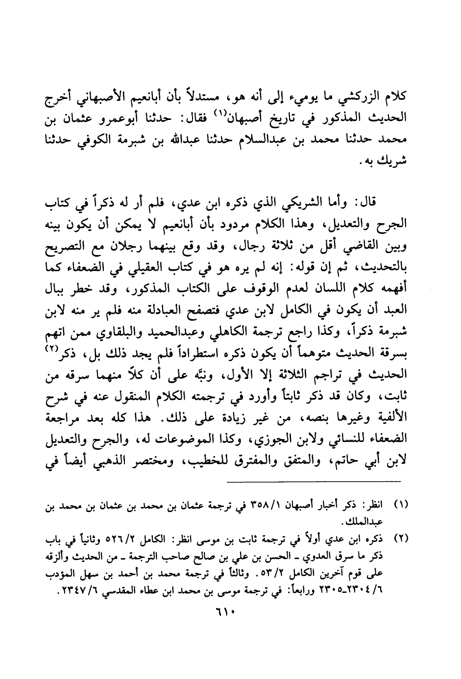 قال: وأما الشريكي الذي ذكره ابن عدي، فلم أر له ذكرًا في كتاب الجرح والتعديل، وهذا الكلام مردود بأن أبا نعيم لا يمكن أن يكون بينه وبين القاضي أقل من ثلاثة رجال، وقد وقع بينهما رجلان مع التصريح بالتحديث، ثم إن قوله: إنه لم يره هو في كتاب العقيلي في الضعفاء كما أفهمه كلام اللسان لعدم الوقوف على الكتاب المذكور، وقد خطر ببال العبد أن يكون في الكامل لابن عدي فتصفح العبادلة منه فلم ير منه لابن شبرمة ذكرًا، وكذا راجع ترجمة الكاهلي وعبد الحميد والبلقاوي ممن أتهم بسرقة الحديث متوهمًا أن يكون ذكره استطرادًا فلم يجد ذلك بل، ذكر الحديث في تراجم الثلاثة إلا الأول، ونبه على أن كلا منهما سرقه من ثابت، وكان قد ذكر ثابتًا وأورد في ترجمته الكلام المنقول عنه في شرح الألفية وغيرها بنصه، من غير زيادة على ذلك. هذا كله بعد مراجعة الضعفاء للنسائي ولابن الجوزي، وكذا الموضوعات له، والجرح والتعديل لابن أبي حاتم، والمتفق والمفترق للخطيب، ومختصر الذهبي أيضًا في