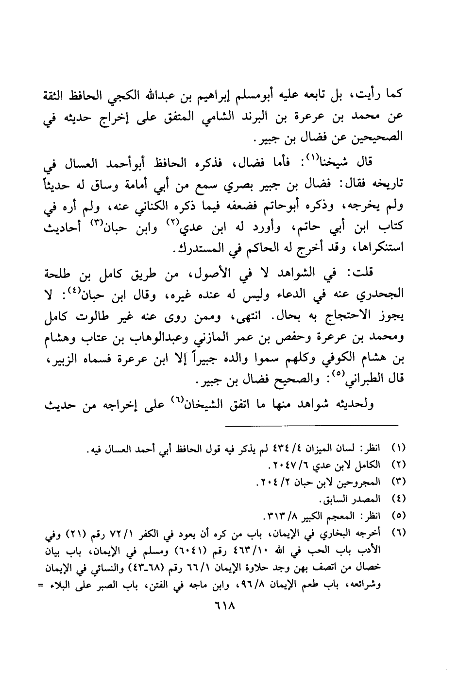 كما رأيت، بل تابعه عليه أبو مسلم إبراهيم بن عبد الله الكجي الحافظ الثقة عن محمد بن عرعرة بن البرند الشامي المتفق على إخراج حديثه في الصحيحين عن فضال بن جبير.