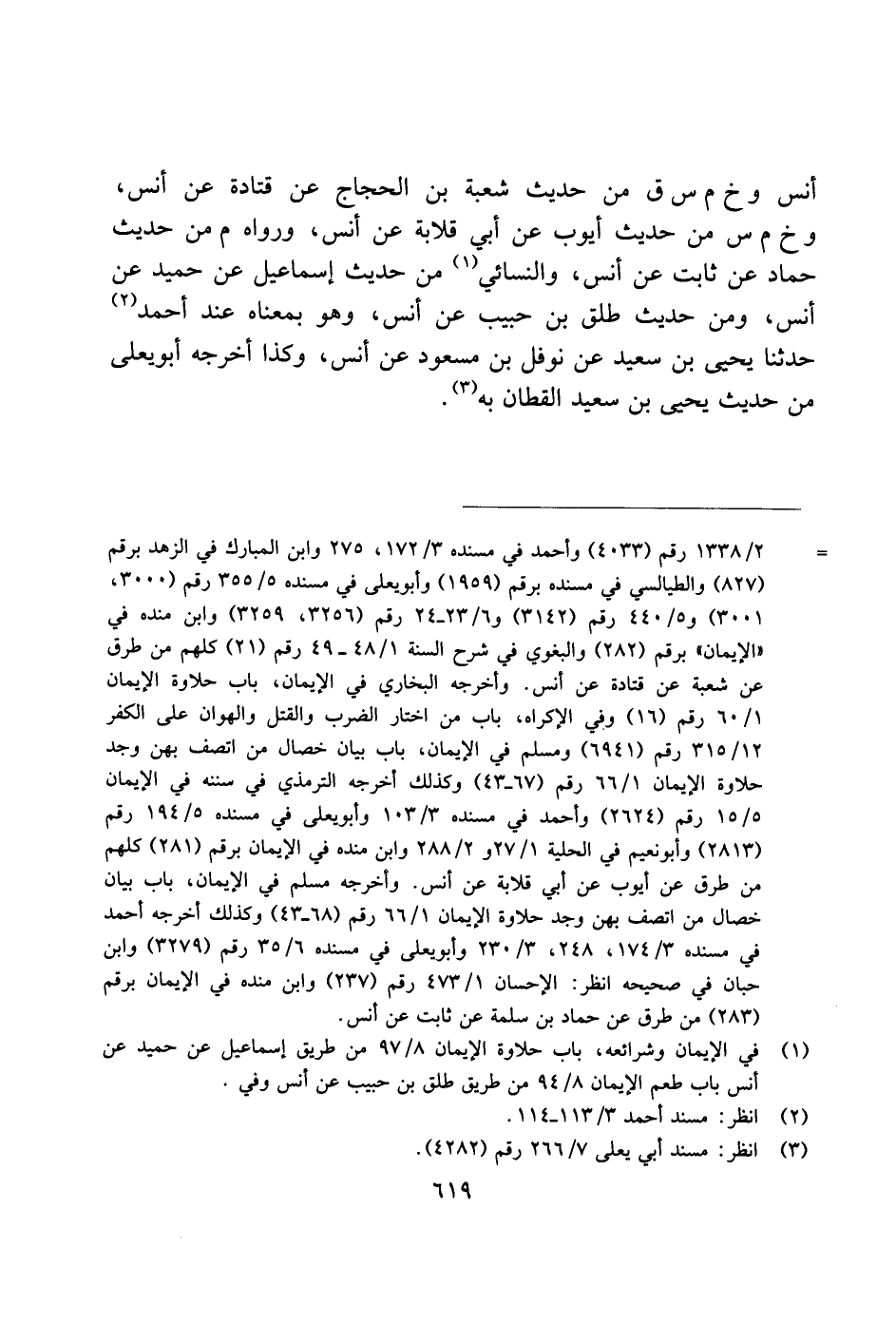 أنس وخ م س ق من حديث شعبة بن الحجاج عن قتادة عن أنس، وخ م س من حديث أيوب عن أبي قلابة عن أنس، ورواه م من حديث حماد عن ثابت عن أنس، والنسائي من حديث إسماعيل عن حميد عن أنس، ومن حديث طلق بن حبيب عن أنس، وهو بمعناه عند أحمد حدثنا يحيى بن سعيد عن نوفل بن مسعود عن أنس، وكذا أخرجه أبويعلى من حديث يحيى بن سعيد القطان به.