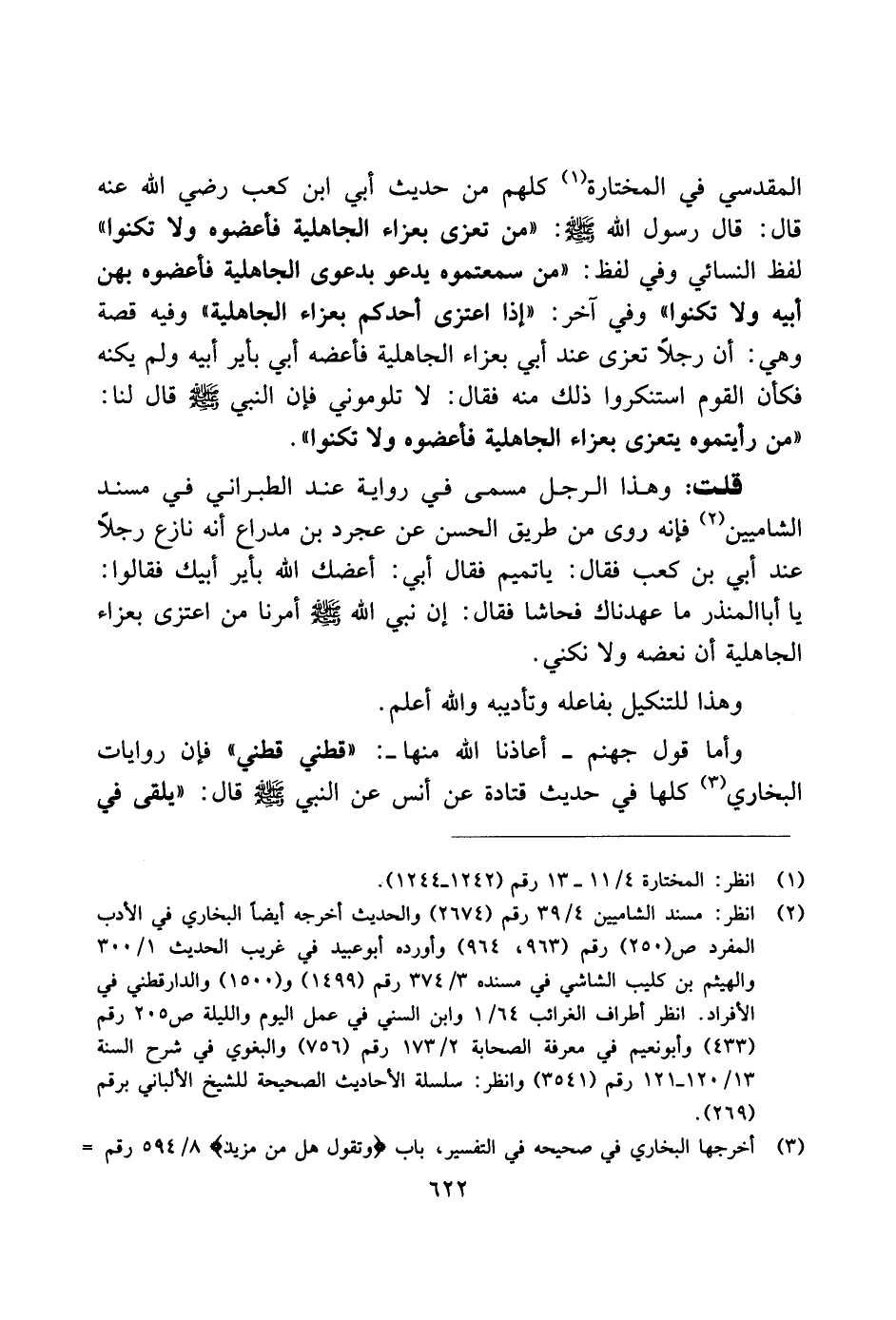 المقدسي في المختارة كلهم من حديث أبي ابن كعب رضي الله عنه قال: قال رسول الله صلى الله عليه وسلم: "من تعزى بعزاء الجاهلية فأعضوه ولا تكنوا" لفظ النسائي وفي لفظ: "من سمعتموه يدعو بدعوى الجاهلية فأعضوه بهن أبيه ولا تكنوا" وفي آخر: "إذا اعتزى أحدكم بعزاء الجاهلية" وفيه قصة وهي: أن رجلاً تعزى عند أبي بعزاء الجاهلية فأعضه أبي بأير أبيه ولم يكنه فكأن القوم استنكروا ذلك منه فقال: لا تلوموني فإن النبي صلى الله عليه وسلم قال لنا: "من رأيتموه يتعزى بعزاء الجاهلية فأعضوه ولا تكنوا".