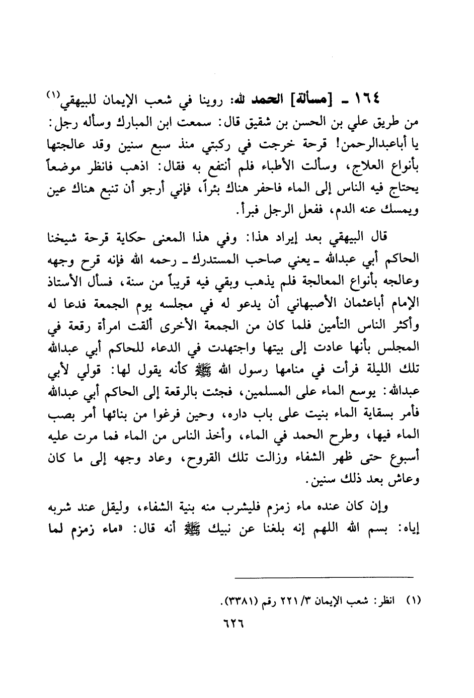 164 - [مسألة] الحمد لله: روينا في شعب الإيمان للبيهقي من طريق علي بن الحسن بن شقيق قال: سمعت ابن المبارك وسأله رجل: يا أبا عبد الرحمن! قرحة خرجت في ركبتي منذ سبع سنين وقد عالجتها بأنواع العلاج، وسألت الأطباء فلم أنتفع به فقال: اذهب فانظر موضعًا يحتاج فيه الناس إلى الماء فاحفر هناك بئرًا، فإني أرجو أن تنبع هناك عين ويمسك عنه الدم، ففعل الرجل فبرأ.
