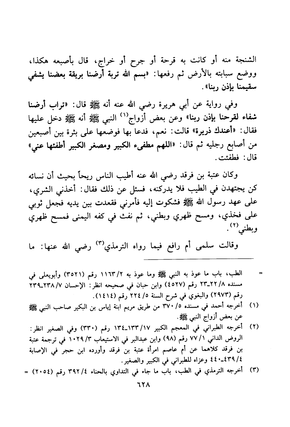 وفي رواية عن أبي هريرة رضي الله عنه أنه صلى الله عليه وسلم قال: "تراب أرضنا شفاء لقرحنا بإذن ربنا" وعن بعض أزواج النبي صلى الله عليه وسلم أنه صلى الله عليه وسلم دخل عليها فقال: "أعندك ذريرة" قالت: نعم، فدعا بها فوضعها على بثرة بين أصبعين من أصابع رجليه ثم قال: "اللهم مطفئ الكبير ومصغر الكبير أطفئهاعني" قال: فطفئت.