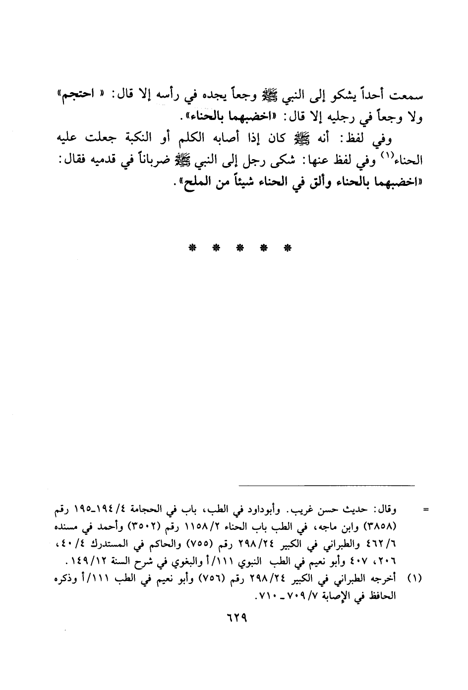 وفي لفظ: أنه صلى الله عليه وسلم كان إذا أصابه الكلم أو النكبة جعلت عليه الحناء وفي لفظ عنها: شكى رجل إلى النبي صلى الله عليه وسلم ضربانًا في قدميه فقال: "اخضبهما بالحناء وألق في الحناء شيئًا من الملح".