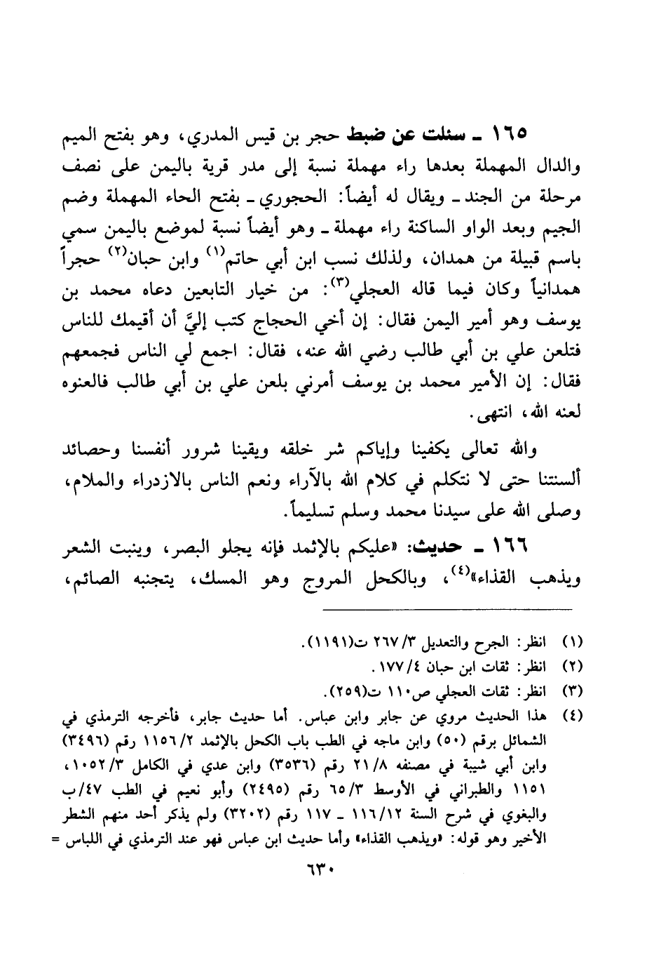 165 - سئلت عن ضبط حجر بن قيس المدري، وهو بفتح الميم والدال المهملة بعدها راء مهملة نسبة إلى مدر قرية باليمن على نصف مرحلة من الجند ـ ويقال له أيضًا: الحجوري ـ بفتح الحاء المهملة وضم الجيم وبعد الواو الساكنة راء مهملة ـ وهو أيضًا نسبة لموضع باليمن سمي باسم قبيلة من همدان، ولذلك نسب ابن أبي حاتم وابن حبان حجرًا همدانيًا وكان فيما قاله العجلي: من خيار التابعين دعاه محمد بن يوسف وهو أمير اليمن فقال: إن أخي الحجاج كتب إليَّ أن أقيمك للناس فتلعن علي بن أبي طالب رضي الله عنه، فقال: اجمع لي الناس فجمعهم فقال: إن الأمير محمد بن يوسف أمرني بلعن علي بن ابي طالب فالعنوه لعنه الله، انتهى.