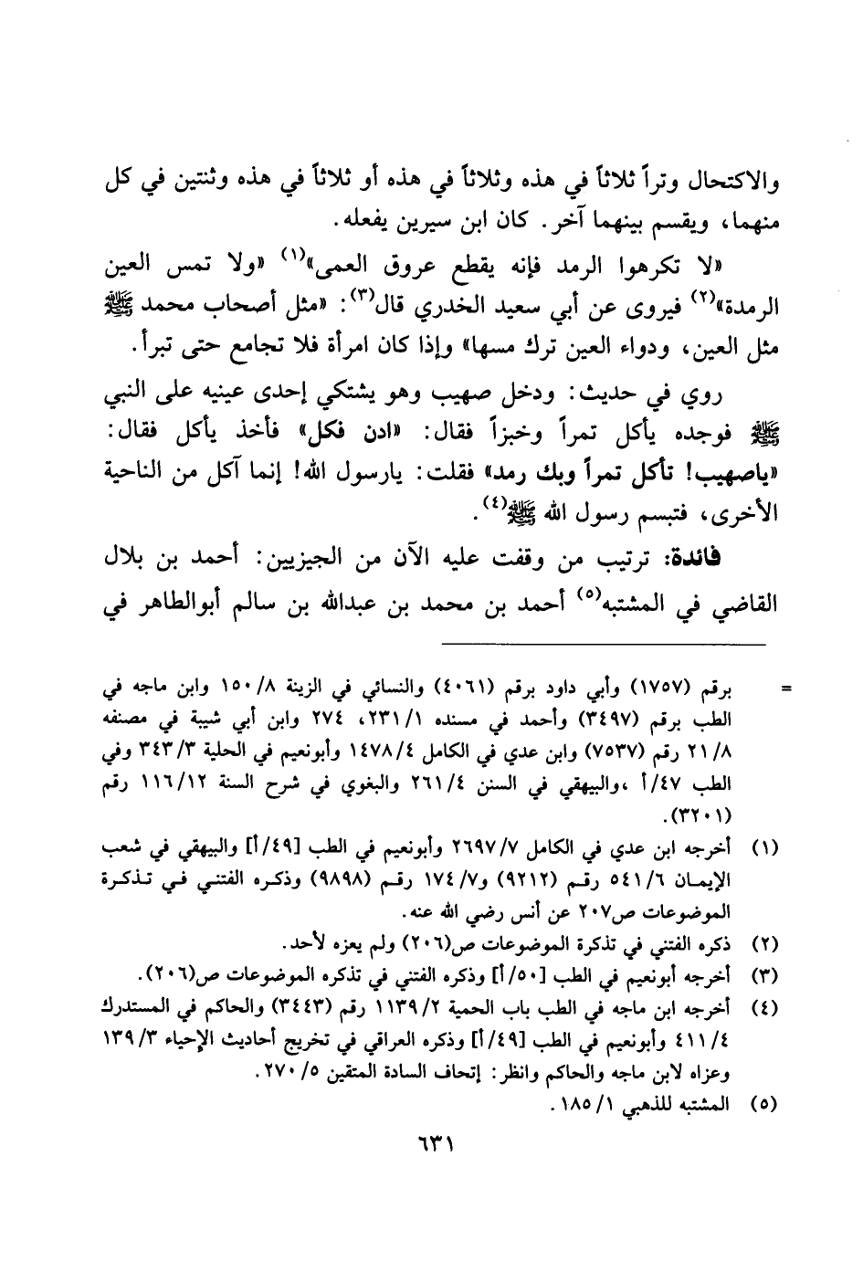 روي في حديث: ودخل صهيب وهو يشتكي إحدى عينيه على النبي صلى الله عليه وسلم فوجده يأكل تمرًا وخبزًا فقال: "ادن فكل" أخذ يأكل فقال: "يا صهيب! تأكل تمرًا وبك رمد" فقلت: يا رسول الله! إنما آكل من الناحية الأخرى، فتبسم رسول الله صلى الله عليه وسلم.