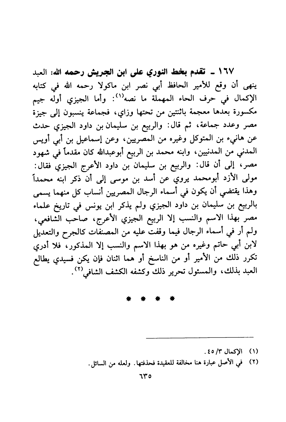 167 - تقدم بخط النوري على ابن الجريش رحمه الله: العد ينهى أن وقع للأمير الحافظ أبي نصر ابن ماكولا رحمه الله في كتابه الإكمال في حرف الحاء المهملة ما نصه: وأما الجيزي أوله جيم مكسورة بعدها معجمة باثنتين من تحتها وزاي، فجماعة ينسبون إلى جيزة مصر وعدد جماعة، ثم قال: والربيع بن سليمان بن داود الجيزي حدث عن هانئ بن المتوكل وغيره من المصريي، وعن إسماعيل بن ابي أويس المدني من المدنيين، وابنه محمد بن الربيع أبو عبد الله كان مقدمًا في شهود مصر، إلى أن قال: والربيع بن سليمان بن داود الأعرج الجيزي فقال: مولى الأزد أبو محمد يروي عن أسد بن موسى إلى أن ذكر ابنه محمدًا وهذا يقتضي أن يكون في أسماء الرجال المصريين أنساب كل منها يسمى بالربيع بن سليمان بن داود الجيزي ولم يذكر ابن يونس في تاريخ علماء مصر بهذا الاسم والنسب إلا الربيع الجيزي الأعرج، صاحب الشافعي، ولم ار في أسماء الرجال فيما وقفت عليه من المصنفات كالجرح والتعديل لابن ابي حاتم وغيره من هو بهذا الاسم وانسب إلا المذكور، فلا أدري تكرر ذلك من الأمير أو من الناسخ أو هما اثنان فإن يكن فسيدي يطالع العبد بذلك، والمسئول تحرير ذلك وكشفه الكشف الشافي.