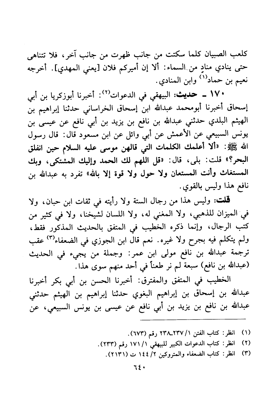170 - حديث: البيهقي في الدعوات: أخبرنا أبو زكريا بن أبي إسحاق أخبرنا أبو محمد بن عبد الله ابن إسحاق الخراساني حدثنا إبراهيم بن الهيثم البلدي حدثني عبد الله بن نافع بن يزيد بن أبي نافع عن عيسى بن يونس السبيعي عن الأعمش عن أبي وائل عن ابن مسعود قال: قال رسول الله صلى الله عليه وسلم: "ألا أعلمك الكلمات التي قالهن موسى عليه السلام حين انفلق البحر؟ "قلت: بلى، قال: "قل اللهم لك الحمد وإليك المشتكى، وبك المستغاث وأنت المستعان ولا حول ولا قوة إلا بالله" تفرد به عبد الله بن نافع هذا وليس بالقوي.