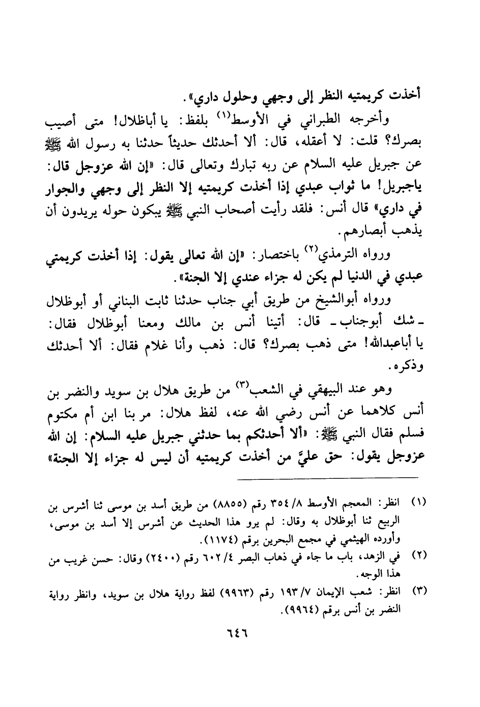 واخرجه الطبراني في الأسوط بلفظ: يا أبا ظلال! متى أصيب بصرك؟ قلت: لا أعقله، قال: ألا أحدثك حديثًا حدثنا به رسول الله صلى الله عليه وسلم عن جبريل عليه السلام عن ربه تبارك وتعالى قال: "إن الله عز وجل قال: يا جبريل! ما ثواب عبدي إذا أخذت كريمتيه إلا النظر إلى وجهي والجوار في داري" قال أنس: فلقد رأيت أصحاب النبي صلى الله عليه وسلم بيبكون حوله يريدون أن يذهب أبصارهم.