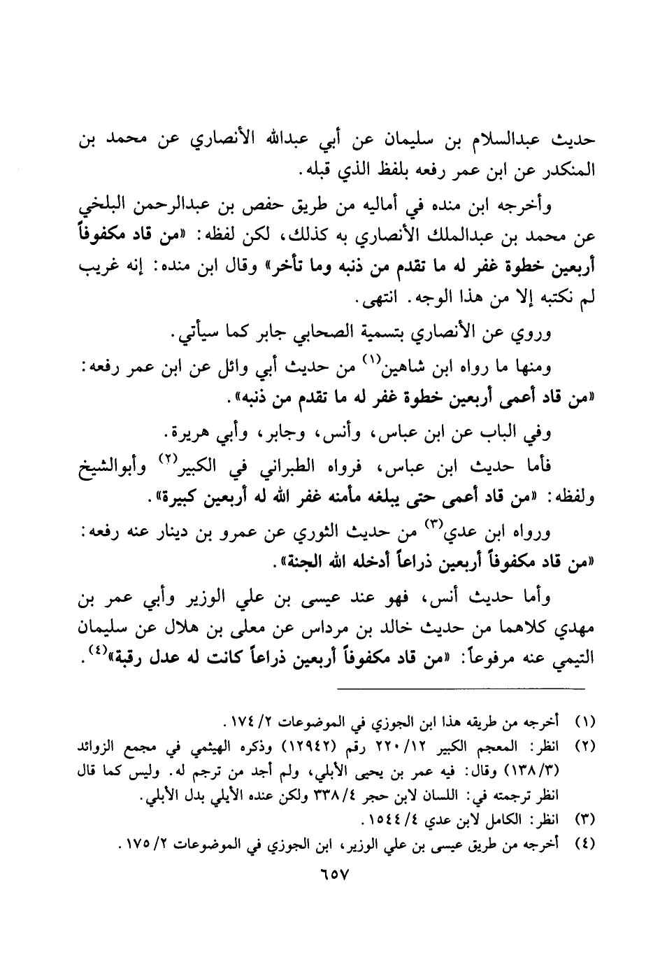 فأما حديث ابن عباس، فرواه الطبراني في الكبير وأبو الشيخ ولفظه: "من قاد أعمى حتى يبلغه مأمنه غفر الله له أربعين كبيرة".