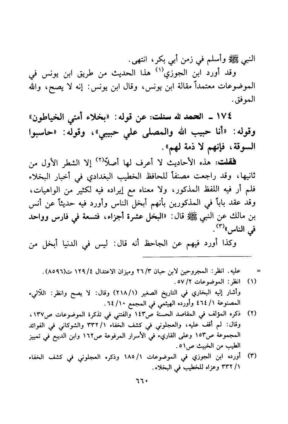174 - الحمد لله سئلت: عن قوله: "بخلاء أمتي الخياطون" وقوله: "أنا حبيب الله والمصلى على حبيبي"،وقوله: "حاسبوا السوقة، فإنهم لا ذمة لهم".