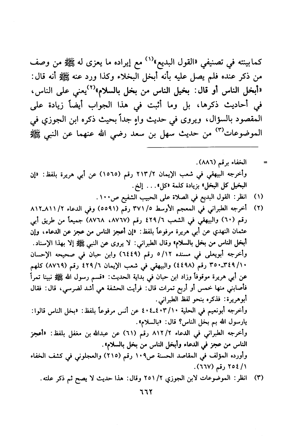 كما بينته في تصنيفي "القول البديع" مع إيراده ما يعزى له صلى الله عليه وسلم من وصف من ذكر عنده فلم يصل عليه بأنه أبخل البخلاء وكذا ورد عنه صلى الله عليه وسلم أنه قال: "ابخل الناس أو قال: بخيل الناس من بخل بالسلام" يعني على الناس، في أحاديث ذكرها، بل وما أثبت في هذا الجواب أيضًا زيادة على المقصود بالسؤال، ويرى في حديث واهٍ جدًا بحيث ذكره ابن الجوزي في الموضوعات من حديث سهل بن سعد رضي الله عنهما عن النبي صلى الله عليه وسلم