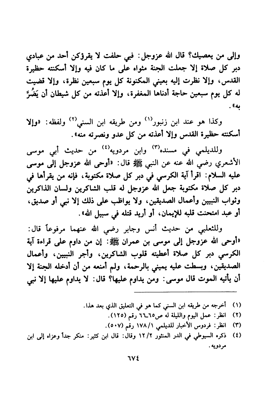 وإلى من يعصيك؟ قال الله عز وجل: فبي حلفت لا يقرؤكن أحد من عبادي دبر كل صلاة إلا جعلت الجنة مثواه على ما كان فيه وإلا أسكنته حظيرة القدس، وإلا نظرت إليه بعيني المكنونة كل يوم سبعين نظرة، وإلا قضيت له كل يوم سبعين حاجة أدناها المغفرة، وإلا أعذته من كل شيطان أن يضر به".